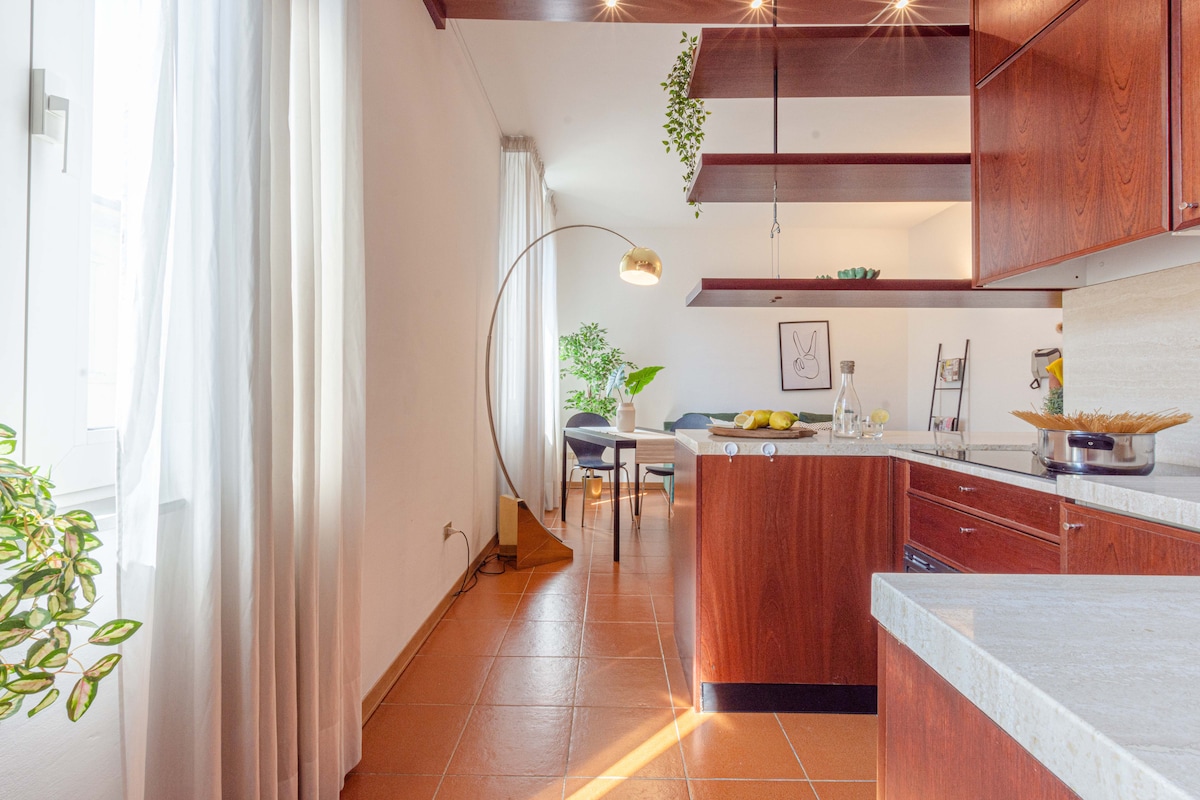 This cozy apartment is the attic of a nineteenth century four-storey building, in the old town of Pistoia. We recently renovated it keeping its traditional and typical details (like the exposed wooden beams and the brick walls). We furnished it mixing antiques and vintage furniture, found in flea markets all over Italy and in our childhood houses. The windows overlook the red roofs of the ancient buildings, the tall trees of the park nearby and the guard tower of the sixteenth century fortress.