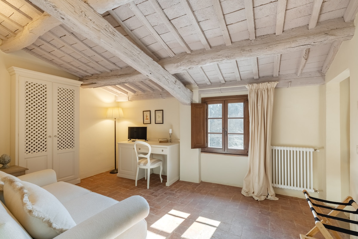 In a 1200's building in mellow stone, part of an antique castle, between Florence and Lucca's area, you will be accomodated at the first floor a private suite composed by a central sittingroom with fireplace, satellite smart tv, sofa and armchairs, a double bedroom, another bedroom with two single beds. A bathroom with shower, basin a wc complete this room. The view from the room is lovely, on the mountain and on a medieval hamlet few kms away.