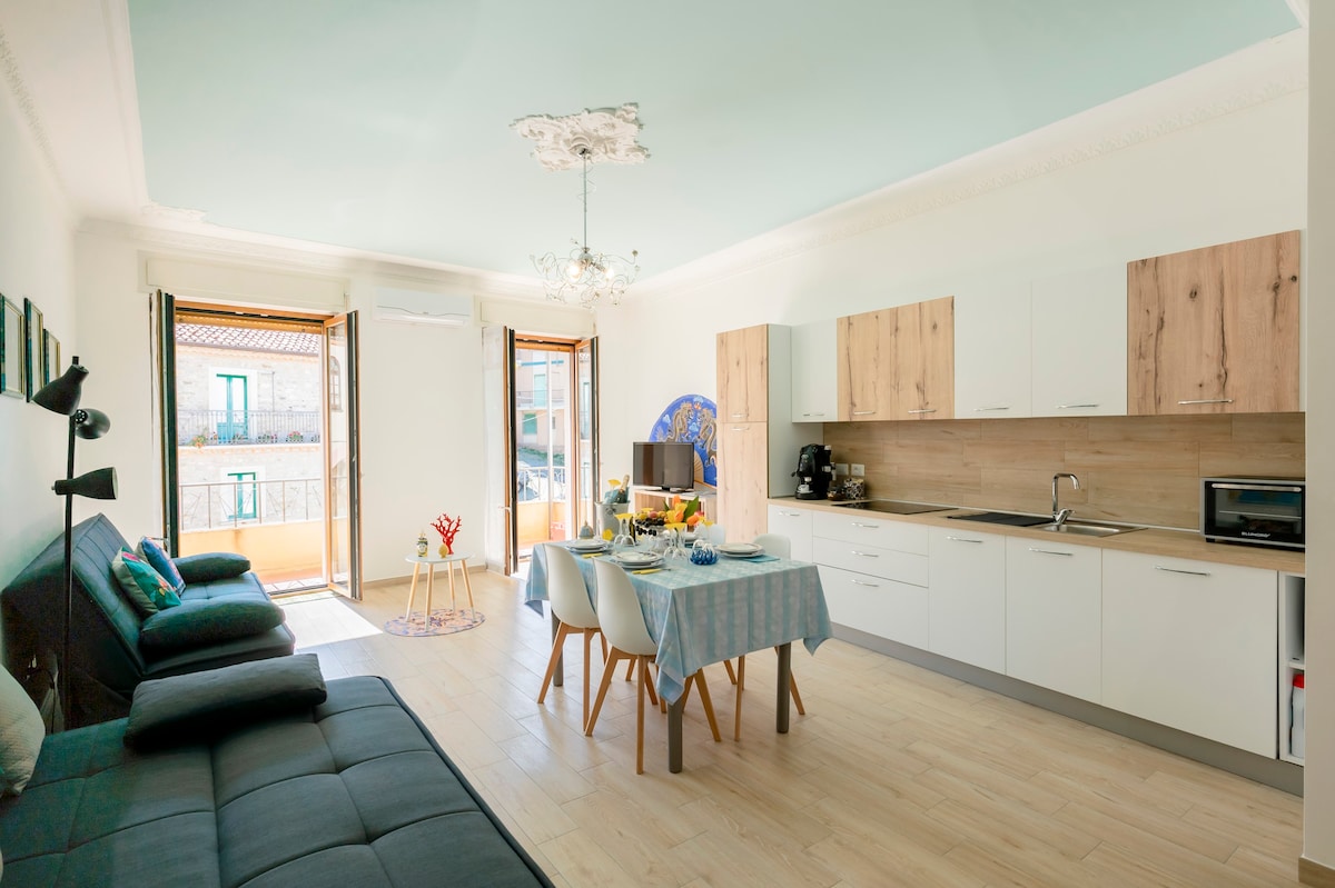 La nostra casa di famiglia di origine. L'appartamento è caratterizzato dalle belle cementine originali: è luminoso, fresco, ventilato, ben arredato e accessoriato. Comodo e tranquillo, con ampio e fruibile balcone a di 5 mq, vista e posizione esclusiva ed incantevole. Pratico parcheggio esterno, non custodito ma sicuro (caserme Loc.Pol/Carab), a 100 mt. Il cuore del paese con negozi, markets, bar e ristoranti è raggiungibile a piedi in meno di 5' e le spiagge, in auto, in 15'.