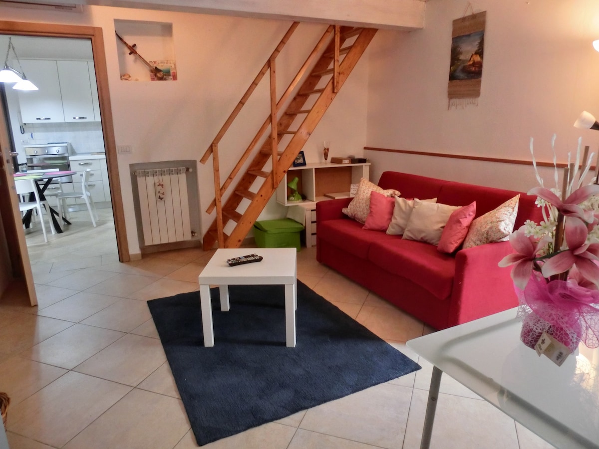 Benvenuti!!! Entrando in casa Irma, c'è un ingresso armadio e attaccapanni. Il bagno è un po' datato. C'è la lavenderia (condivisa) 5€ a lavaggio compresi: prodotti, lavatrice, stendino e asciugatrice (in inverno). la stanza principale ha un soppalco con letto francese. Scala ripida!. Sopra non si sta in piedi. Sotto c'è un divano/letto e il mobile TV. Si passa in cucina, con i fornelli. a gas. Sul terrazzo (condiviso) potrete stare su tavolo divano, poltrone e amaca (non in inverno). Grazie!