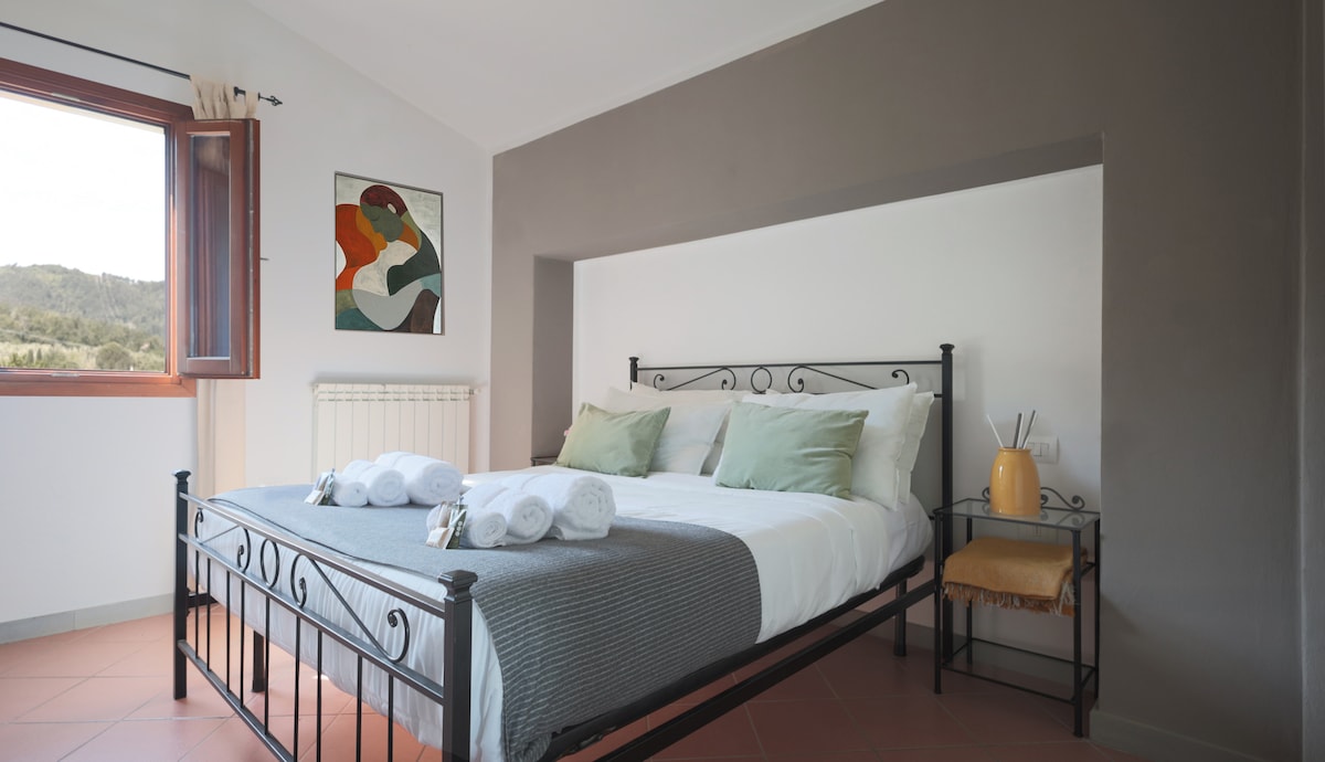 Nelle splendide colline Toscane stupendo appartamento in colonica finemente ristrutturato, con accesso indipendente, composto al piano terra da un ampio soggiorno-cucina, al piano primo una camera matrimoniale una camera con due letti singoli e una ampio bagno al piano secondo una altra camera matrimoniale con bagno privato. Il tutto circondato da ulivi e vigneti e una splendida piscina! L’immobile è dotato di colonnina di ricarica elettrica a disposizione degli ospiti.