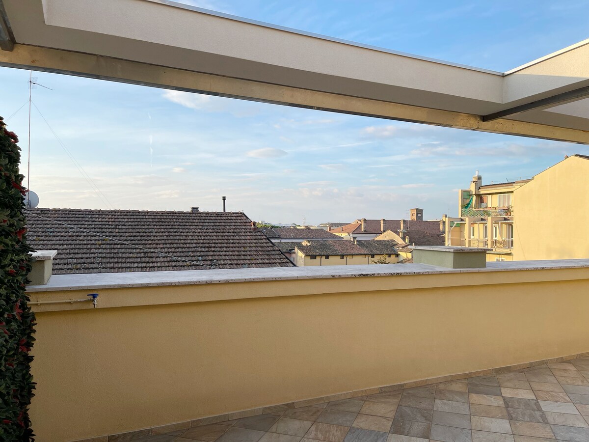 Intero appartamento situato in pieno centro storico( no ZTL ) a Ravenna con posto auto riservato all'interno del giardino condominiale con cancello elettrico a 100 mt dalla Stazione Ferroviaria e degli autobus 300mt da Piazza del Popolo, Composto da: cucina abitabile arredata e corredata, soggiorno ,1 camera matrimoniale 1 camera con 2 letti singoli 2 terrazzi bagno con box doccia, lavatrice, aria condizionata, tv, wifi, lavastoviglie, microonde, forno, macchina caffe' asciugacapelli.