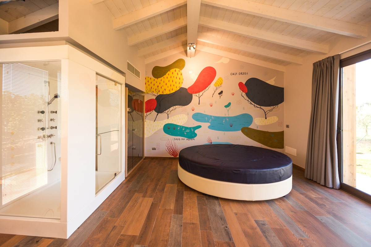 Grande Suite romantica con Letto rotondo. con Jacuzzi,Sauna e Bagno Turco all'interno dell'agriturimo Trerè con Piscina e Ristorante( aperto dal giovedì alla domenica) Un’oasi di benessere , Relax e Intimità in esclusiva per la coppia che la prenota In un ambiente rilassante, lontano dalla frenesia cittadina, tra le nostre splendide vigne potrai rilassarti con chi ami in un ambiente curato in ogni dettaglio Abbiamo a cuore che tu sia felice e ti offriamo una bottiglia del nostro spumante Viola
