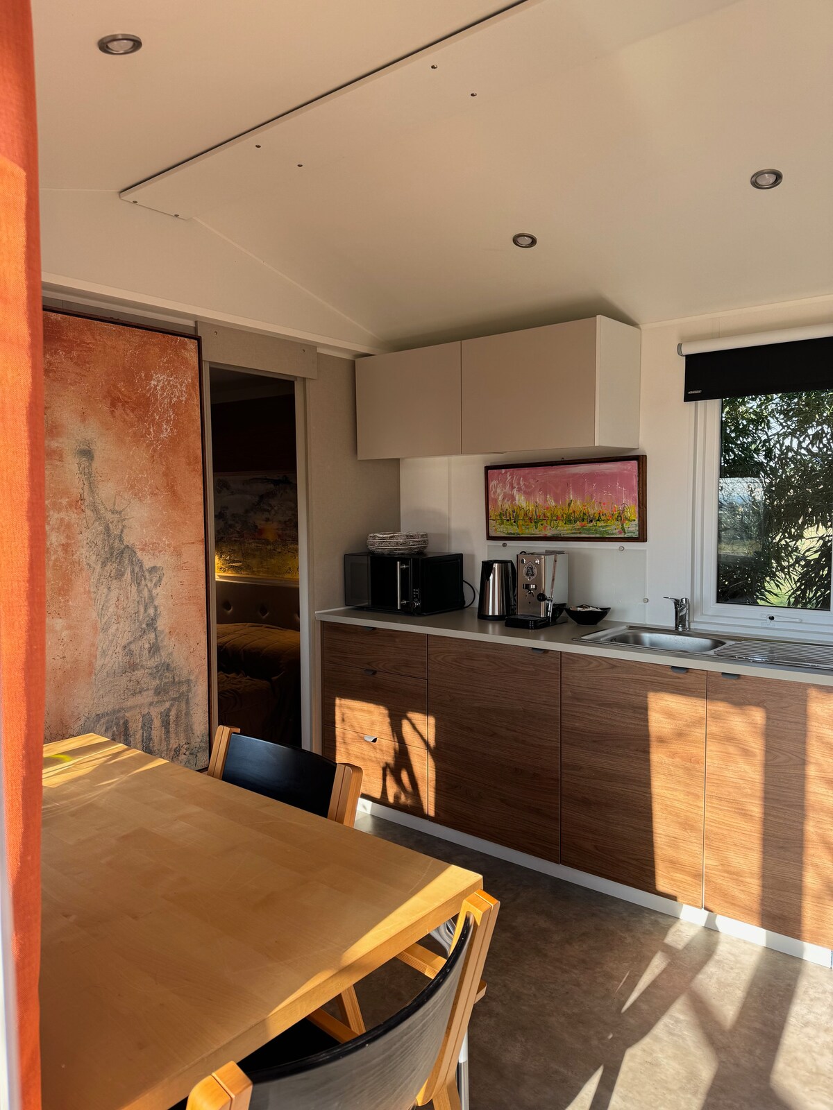 La casa è immersa nella natura, adiacente alla casa dei proprietari. E' un open space indipendente con zona notte soppalcata organizzata in due spazi, dotata di angolo cottura attrezzato, bagno con doccia, soggiorno con tavolo, divano e tv, veranda privata e giardino, con una metratura complessiva di circa 60mq. La casa è pensata per accogliere comodamente 3 persone.