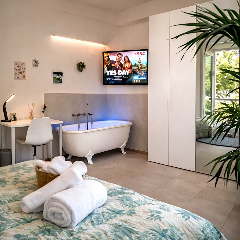 Lovely apartment on Viale dei Mille with 2 double bedrooms, one with a freestanding bathtub and private bathroom, the other with terrace access, plus 1 bathroom and a living area with kitchenette. Equipped with Wi-Fi, Smart TV, Netflix and chromotherapy shower. Also available for exclusive use. Close to the historic center near Piazza Fontanesi.