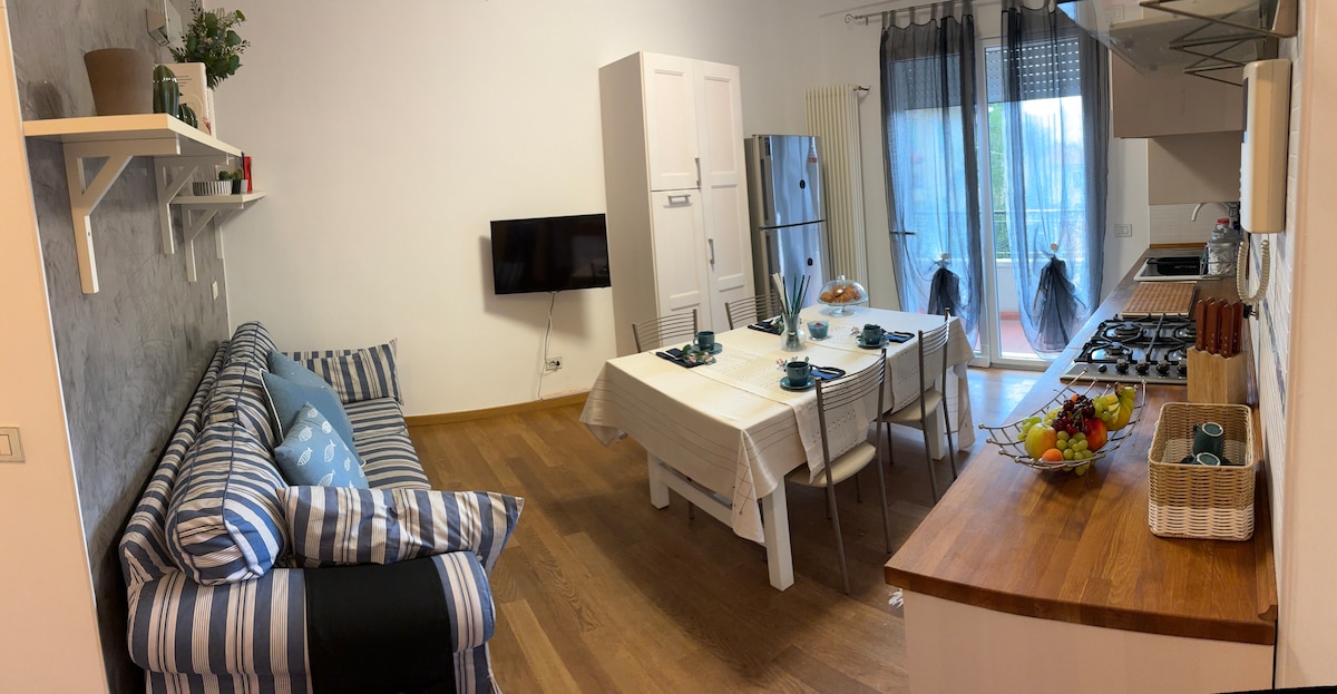 Exclusive penthouse by the sea with breathtaking 360° panoramic views of the beach and the entire city. Completely restored apartment Breathtaking panoramic view, from the sea to the hill. A two-room apartment that offers all the comforts required, from the heated hydromassage tub, to the 75'' Smart TVs in the living room and 65'' in the bedroom with integrated Soundbars, to the super-equipped kitchen. Free parking. Agreement with the TORTUGA BEACH beach in Rimini, a few steps away.