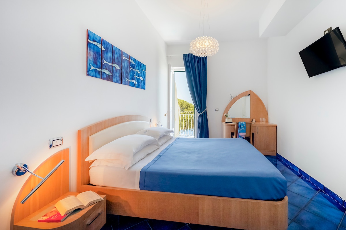 Camera matrimoniale con terrazzino privato vista mare e bagno privato. La camera dispone dei seguenti servizi: aria condizionata/riscaldamento , TV Satellitare lcd a schermo piatto, minibar, asciugacapelli, kit cortesia, Internet Wi-Fi ultra veloce gratuito, servizio in camera disponibile su richiesta. Gli ospiti hanno accesso gratuito alla piscina dell'hotel e colazione a buffet inclusa nel prezzo