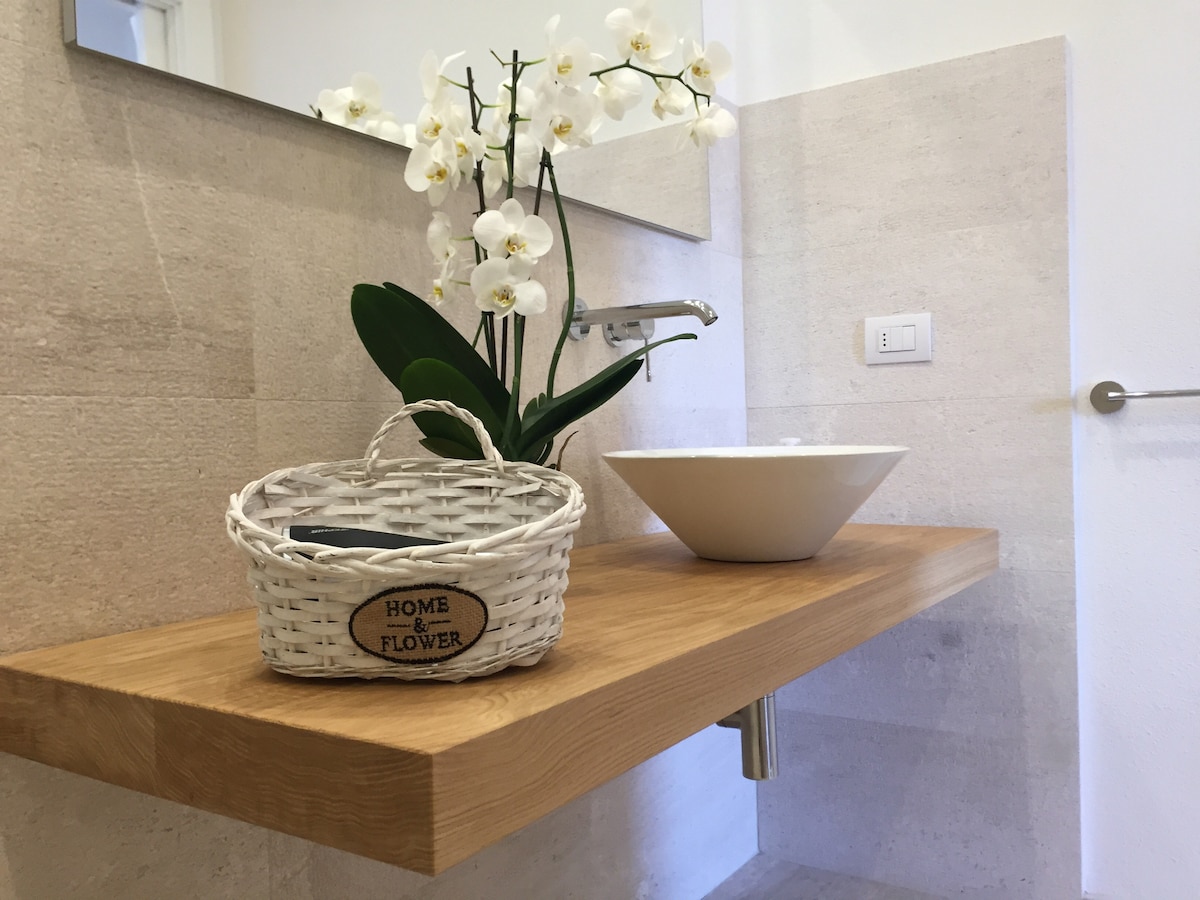 In order to reach the Penthouse you have to use a granite stairway built in the middle of a huge rock and cross a bridge. You get onto a big terrace with a beautiful sea view. You have to step down five stairs to reach the room with its spectacular view. It’s furnished with double bed, table, wardrobe, TV, fridge and air conditioning. The bathroom has shower, sink, WC and bidet. Outside, we installed a small kitchen counter in order to prepare yourself a coffee or a nice plate of pasta.
