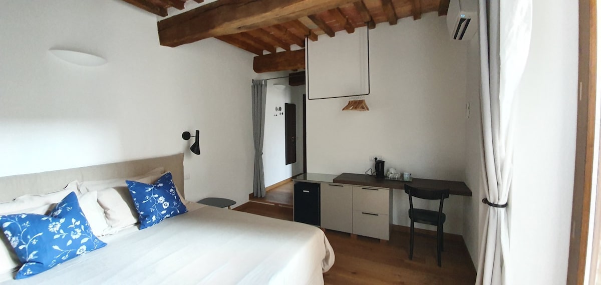Wake up enjoying the slow village life. Staying in a deluxe double room with a king-size bed. Furnished with modern design but keeping intact the characteristics of the context. Parquet, air conditioning, WiFi, satellite TV, private bathroom, electronic lock, safe, refrigerator.