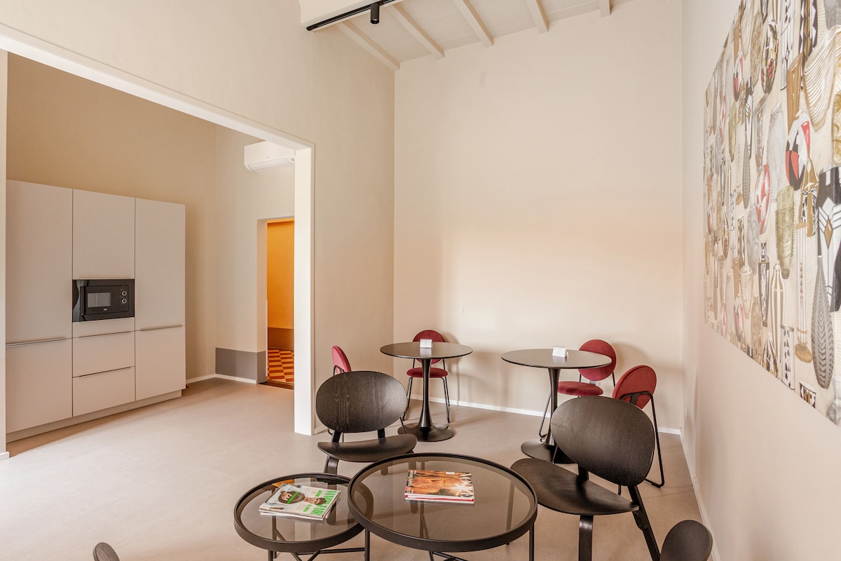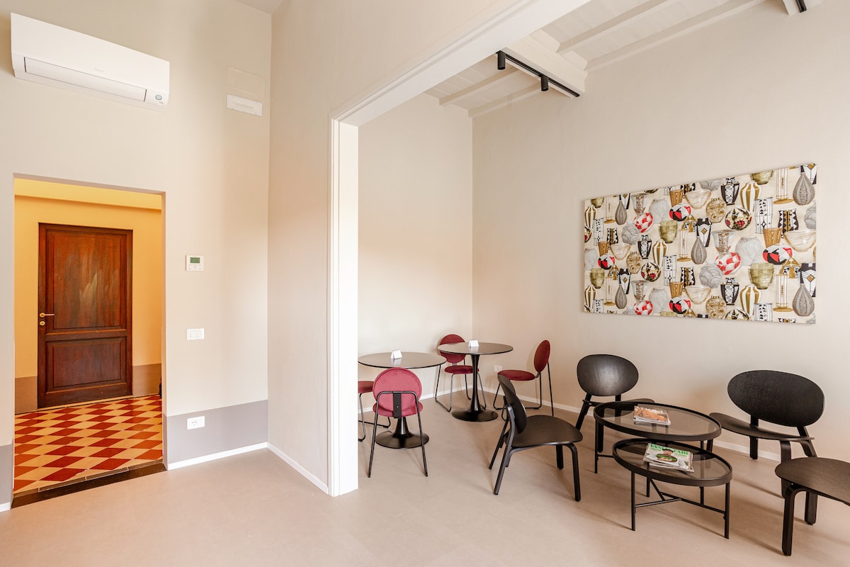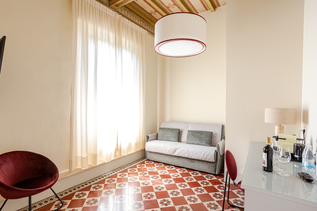 Immerse yourself in refined comfort in our elegant room at San Prospero Heritage. Enjoy a spacious, light-filled room with a king-size bed, designer furnishings, and a luxurious travertine bathroom. Stay connected with fast Wi-Fi, relax with Netflix on a smart TV, and enjoy seamless self check-in. Located in a charming Liberty-style building, just a scenic walk from Siena’s historic center. Many parking options right in front of the Hotel. Second Floor No elevator