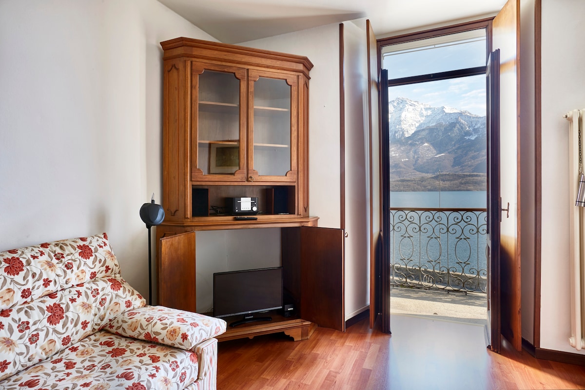 In zona strategica, a 300 metri dalla stazione dei treni, a 10 metri dai traghetti e a 100 metri dai negozi, in palazzo storico dei primi del 900 completamente restaurato. Questo appartamento, all'ultimo piano con ascensore, dispone di 1 camera da letto e 1 divano letto e può ospitare fino a 4 persone, un bagno, una cucina attrezzata, balcone con fantastica vista lago. Aria Condizionata. Punto di partenza per escursioni intorno al lago, con i frequenti traghetti che attraccano proprio sotto casa