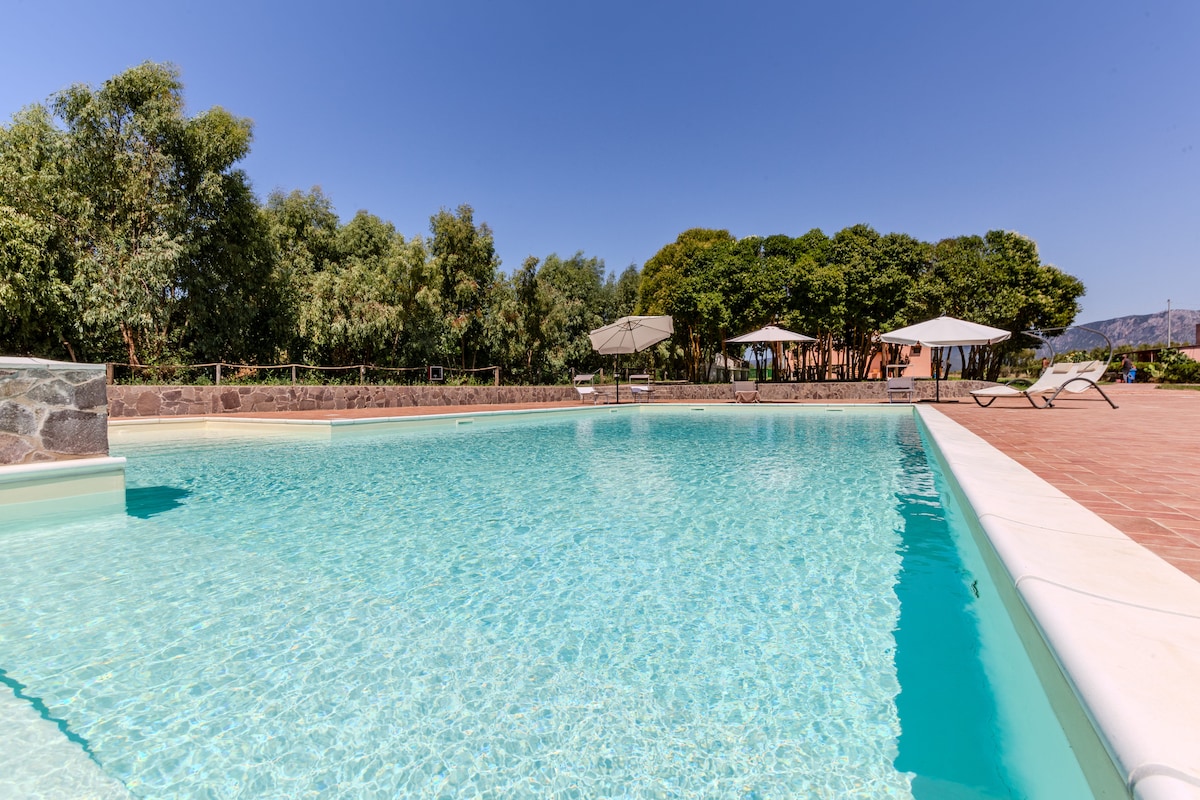 If you are looking for a stay surrounded by nature, in a typical Sardinian natural environment we have at your disposal 5 double bedrooms with private bathrooms and direct access only from the outdoor area. In each room you will find a small fridge and an air conditioner The relaxation area is completed by sun loungers perfect for sunbathing and enjoying the warm climate by the pool.