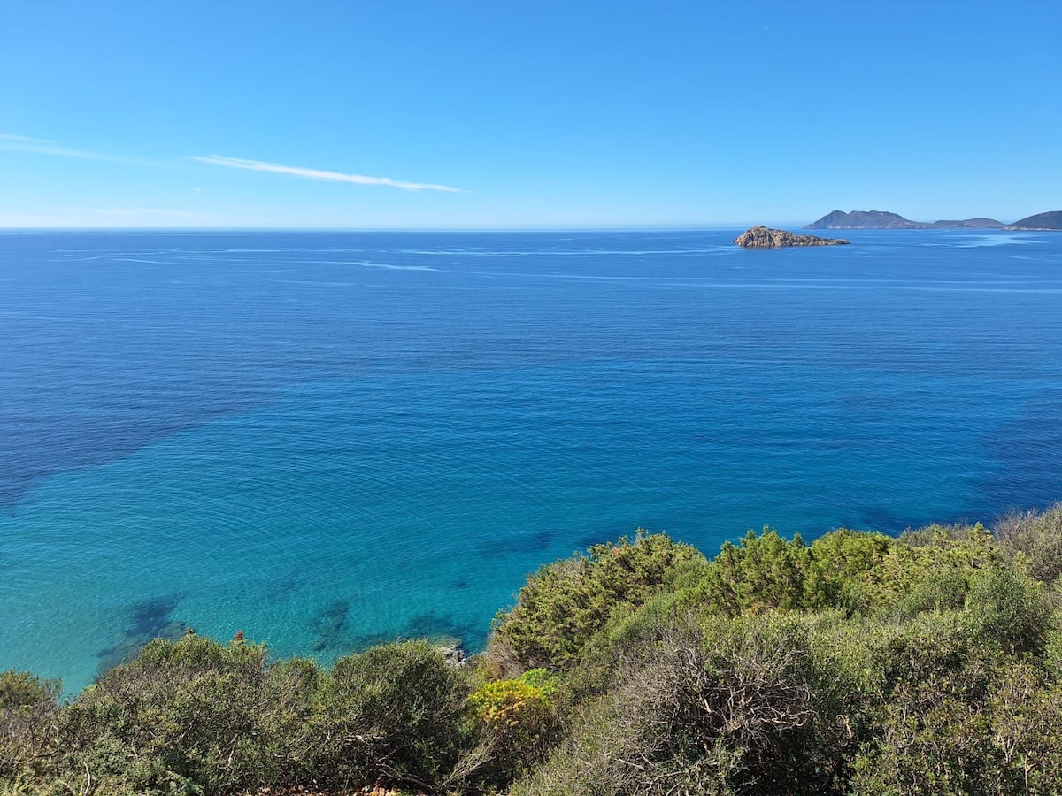 Panoramicissimo appartamento a pochi metri dal mare. Ideale per gli amanti della tranquillità, della natura, macchia mediterranea e per godere appieno della bellezza del mare. Cucina abitabile, due camere matrimoniali, di cui una con bagno privato, 1 camera con due letti, bagno con doccia. Patio coperto attrezzato per consumare i pasti e soggiornare all'aperto. Doccia esterna, barbecue portatile, posto auto all'interno della proprietà.