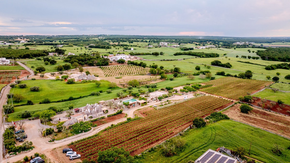 An entire private trulli property consisting of 4 independent apartments. Only for you the large swimming pool, the garden and the shared vegetable garden, the barbecue, the cellar with our wines, the relaxation areas with panoramic views. All this for your private group vacation for up to 16 people.