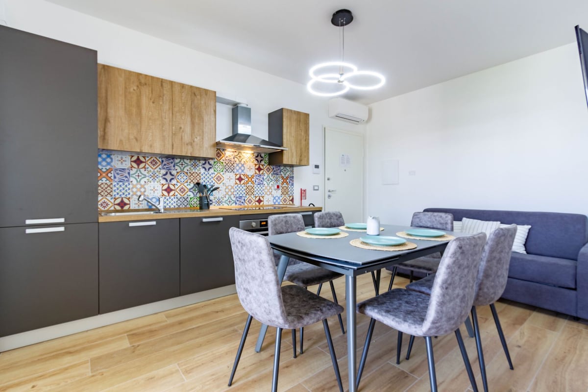The apartment, recently built and fully air conditioned, consists of a large living room with induction kitchenette, dining area with sofa bed, two bedrooms, one double and one with two single beds. Bathroom with shower box and bidet.