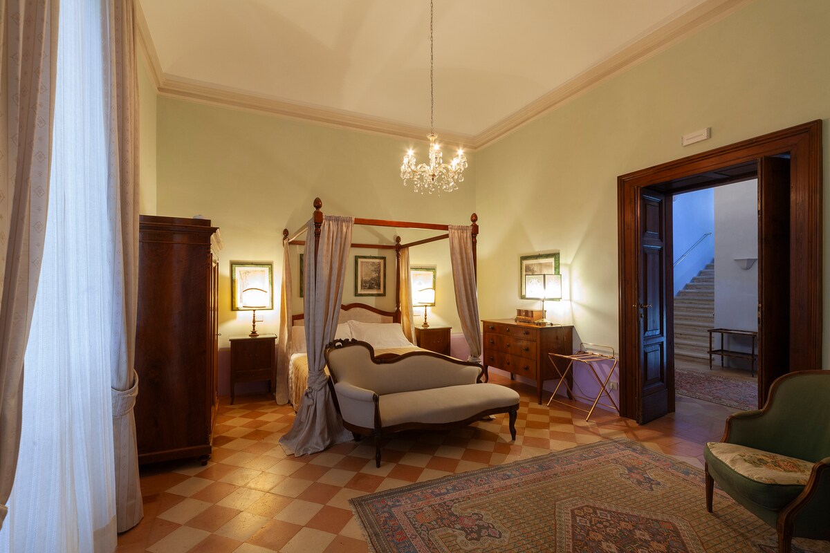 The suite, on the piano nobile of the Villa Seghetti Panichi, our C13-C18th family home, is at the heart of a secluded 17 acre Borgo. Guests can experience sleeping in an ancient residence amongst period furniture and paintings, and enjoy the pool, romantic gardens, citrus terraces, olive groves, wildflower meadow and shaded seating areas. The view sweeps from the sea to the high Apennines. Within 20 mins are sandy Adriatic beaches and fine seafood, and the renaissance jewel of Ascoli Piceno.