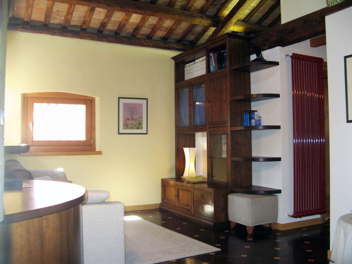 Open plan apartment with balcony and quadrifora century overlooking the old town square felt pad . First level : large open plan room with exposed beams , kitchen and bathroom . Second floor: attic rooms with original wooden beams .