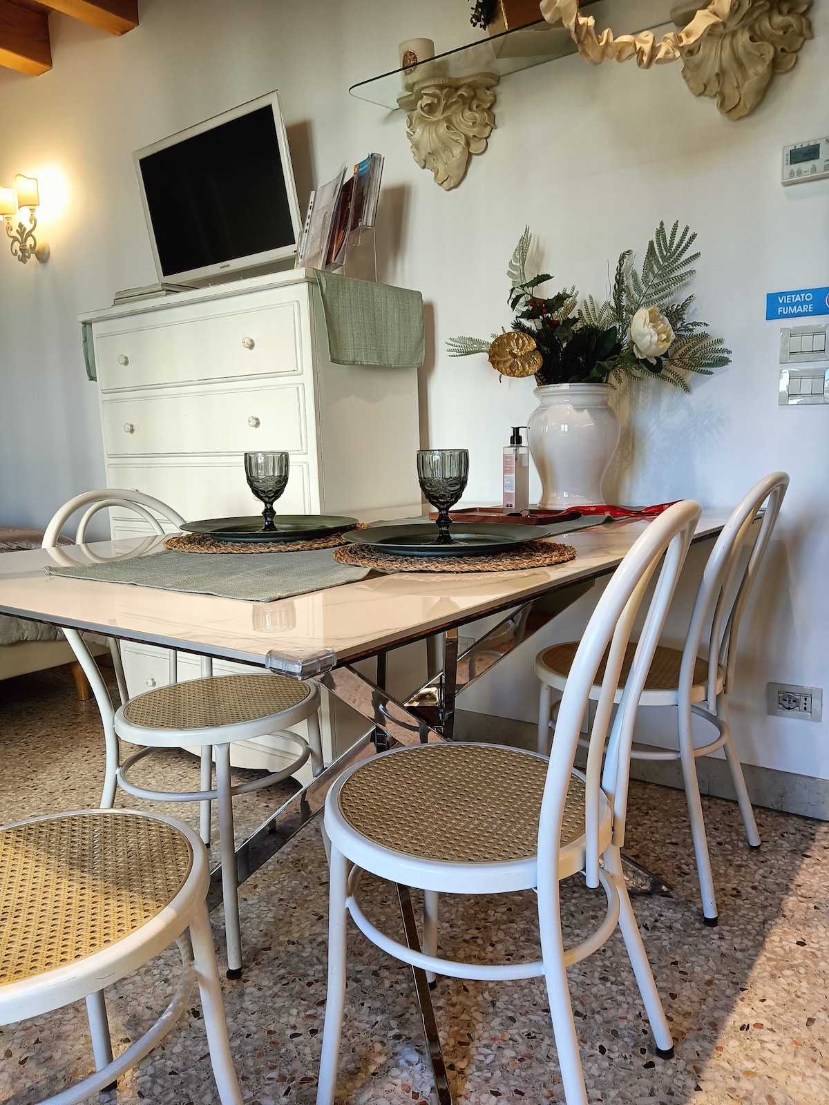 A unique lodging experience in the Loggias of Villa Contarini, one of the most beautiful and largest Venetian Villas designed by Palladio in the 1500s, featuring a must-see guided tour! You will have access to the entire historic residence, including a kitchen, 3 bedrooms, and 2 bathrooms. Free parking is available in the square below, where Italy's largest antique market takes place every last Sunday of the month. A strategic location for visiting Venice, Padua, Vicenza, Treviso, and Verona.