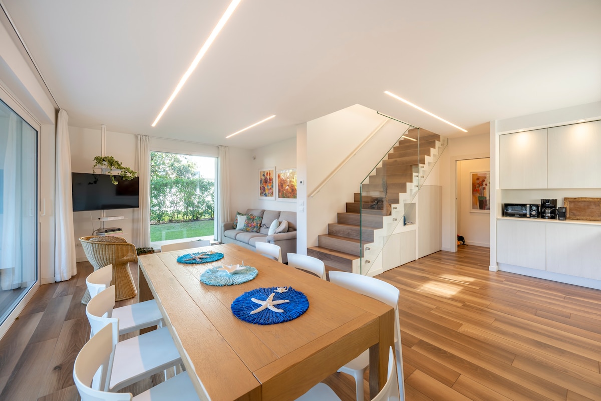 FREE: PARKING, BICYCLE, WI-FI + NETFLIX NO cleaning fees Modern apartment, furnished with care and elegance in a quiet setting but at the same time located a stone's throw from the most beautiful beach in Grado, on the Costa Azzurra. Consisting of 2 bedrooms with 2 double beds, 1 sofa bed for 2 people in the living room, bathroom with window and shower, two terraces, one of which with sea view. Free private parking and 5 bikes available for guests. Free child seat and cot available on request.