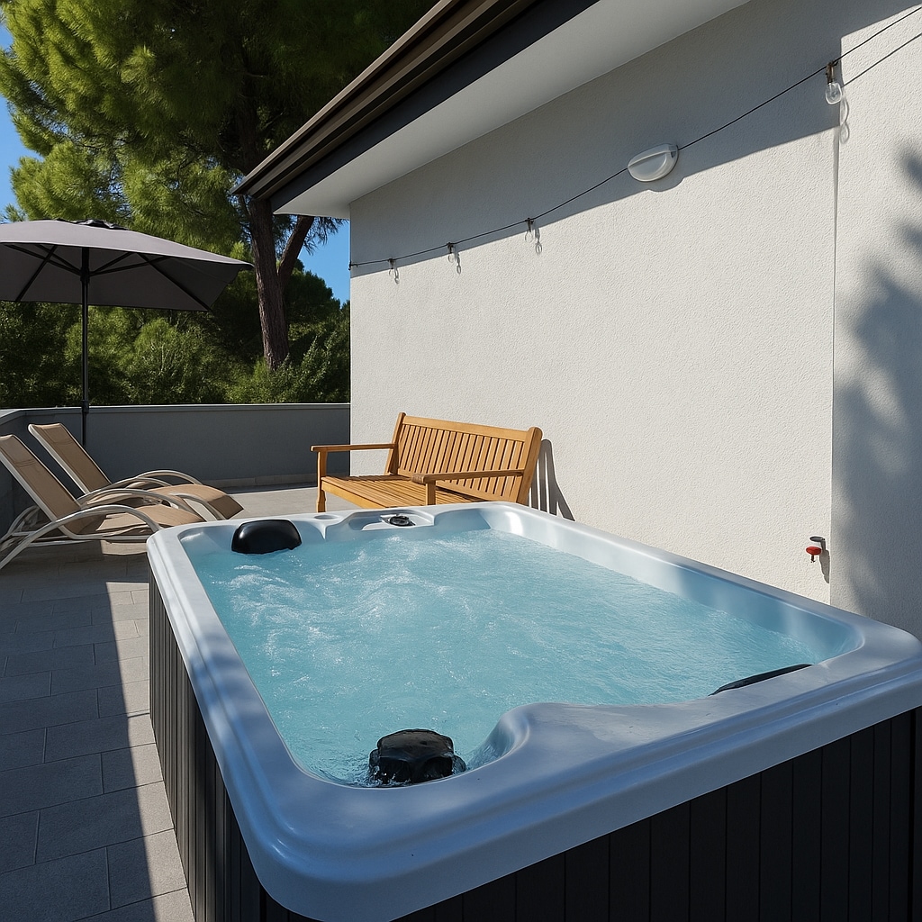 The modern 'Grado House' is located only a few steps away from the main beaches and close to enchanting little islands. Total relaxation a few steps away from the centre, the Grado Spa and the Aquatic Park. The ideal place for an experience of luxury and comfort. It has private uncovered parking (2 cars), a beautiful garden consisting of a heated inflatable Jacuzzi with hydromassage (summer only), 2 sun loungers, a sofa and a patio with outdoor dining table.