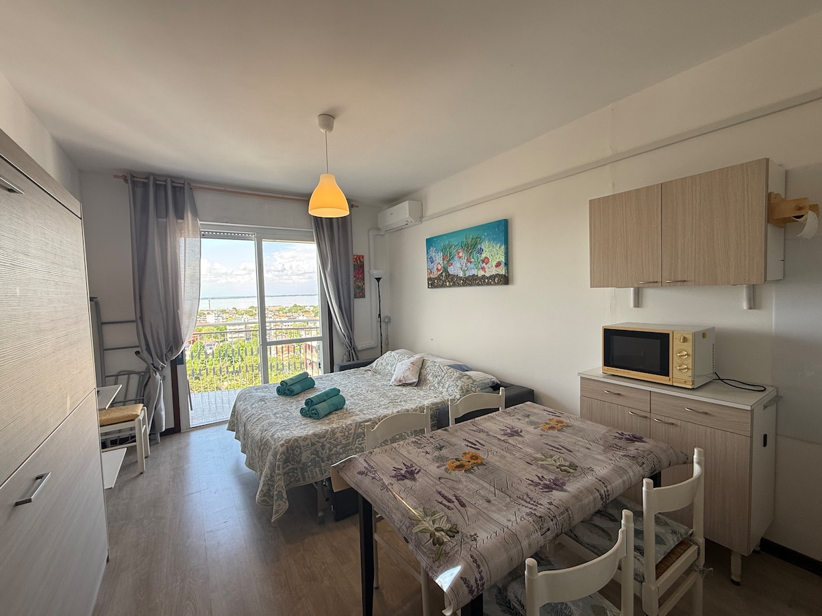 25sqm mezzanine studio flat with 10sqm terrace and reserved parking space in Marcopolo residence with summer pool facing the sea and equipped / free beach. Extra tourist tax to be paid locally to the host 0.70 € per day per person. Deposit of 100 € to be paid on site returned upon delivery of the property on departure. Linen on request extra € 10 on site per person. I can accompany you on arrival at the residence if you need transport ... on request