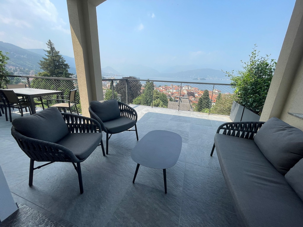 Bright lakeside apartment with stunning views of the lake and mountains. Renovated in Scandinavian style, it has a spacious open-plan area (living, dining, kitchen), three bedrooms, two bathrooms (one is 0.80 sqm), a balcony, and a large terrace. This is my home, filled with my original artworks. As an artist, I prioritize ecology and recycling. Free parking is available. Perfect for a relaxing stay on Lago Maggiore, blending nature, art, and sustainability.