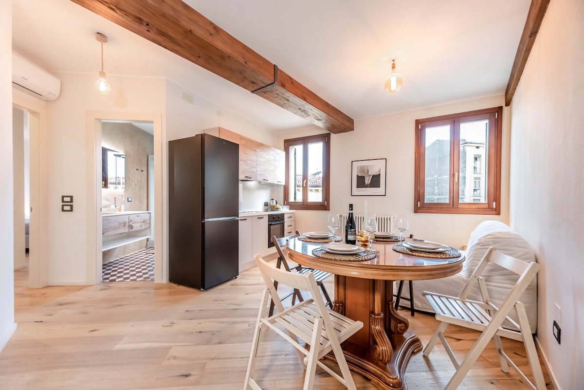 Attic in the Historic City Center – Steps from Verona Arena. Stay in the heart of Verona’s historic center, close to the main cultural attractions. This two-level apartment features a spacious master bedroom with a king-size bed and high-quality topper, along with a stylish bathroom with luxury toiletries.Upstairs, enjoy a bright open-space area with a fully equipped kitchen and elegant lounge.