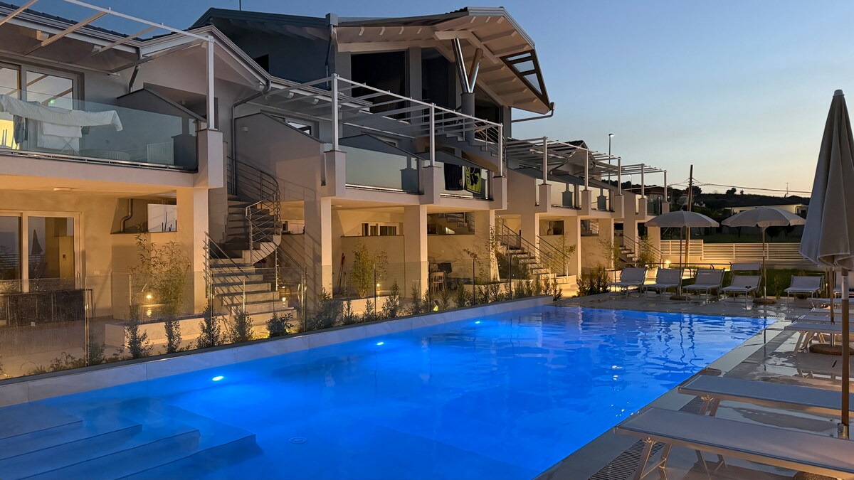 Proponiamo nuovissimi e confortevoli bilocali, arredati con gusto ed eleganza. La struttura offre: piscina con vasca idromassaggio, zona relax a bordo piscina, zona solarium, wi-fi gratuito, parcheggio privato, zona barbecue, docce esterne, lavatrice in comune. La posizione è centralissima, ogni negozio e servizio è a portata di mano. Il mare è raggiungibile anche a piedi tramite una scalinata a soli 500 m dalla struttura oppure in auto in 3 minuti.