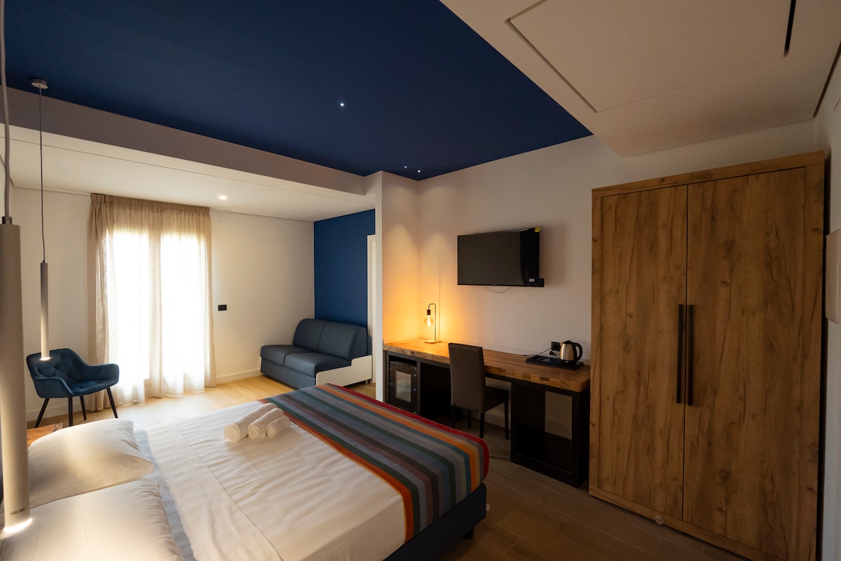 La camera con terrazzo attrezzato, accogliente e luminosa. E’ dotata di letto matrimoniale, bagno privato con doccia, asciugacapelli, kit cortesia, accappatoio, ciabatte, aria condizionata, TV Smart, minibar, Wi-Fi, bollitore e cassetta di sicurezza personale.