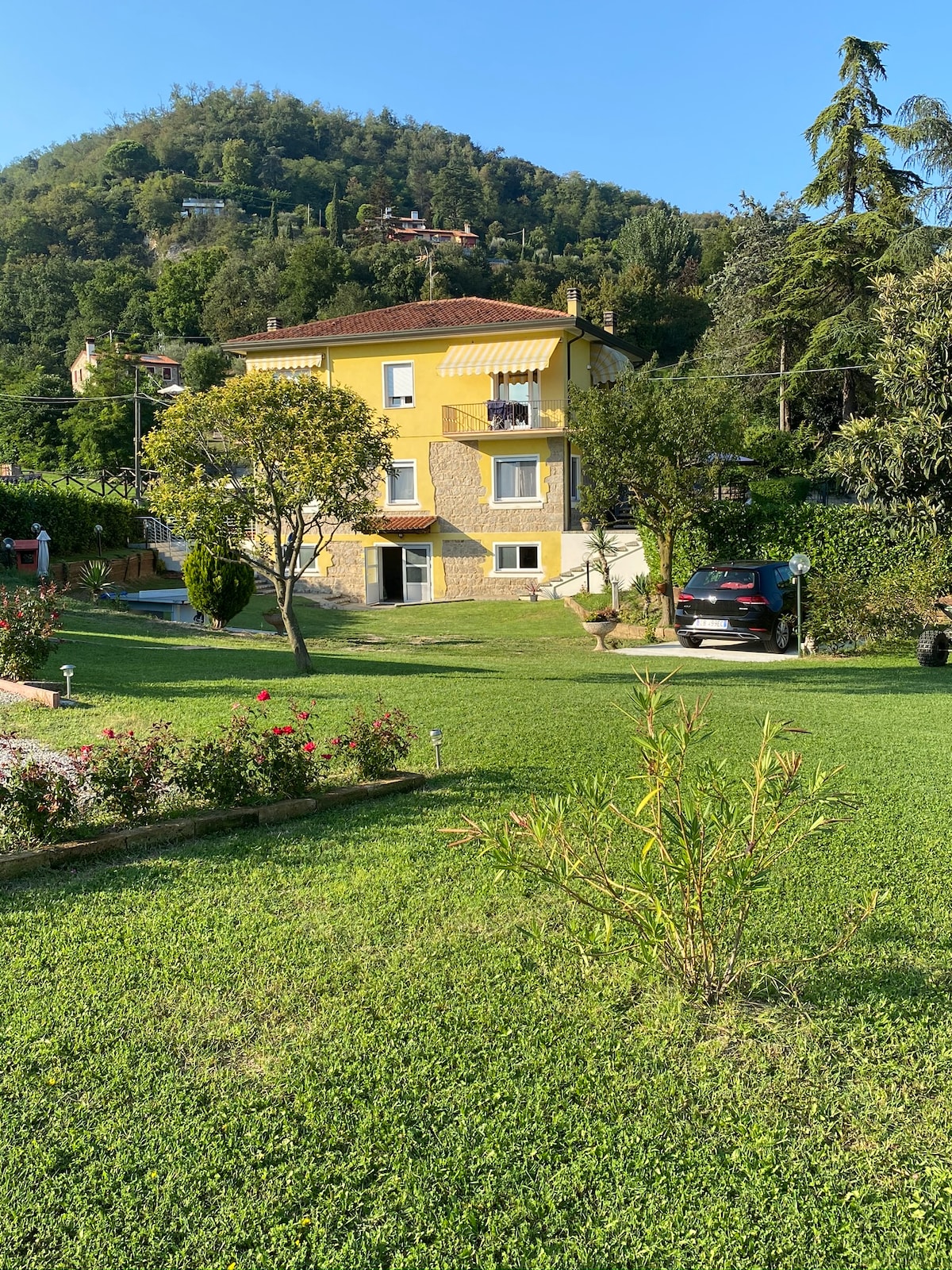 The ideal base for exploring the wonders of Veneto: just an hour's drive from Venice, Verona, Padua and the Dolomites A big, stylish holiday home for recharging and enjoying the panoramic views of the castle of Marostica. The house is pet friendly and accessible, perfect for families, groups, couples, and solo travellers. The house has 4 bathrooms, 4bedrooms, kitchen, living room, fenced garden with bbq, solarium terrace, yoga corner. Close to free Parking lots, ATMs and supermarkets.