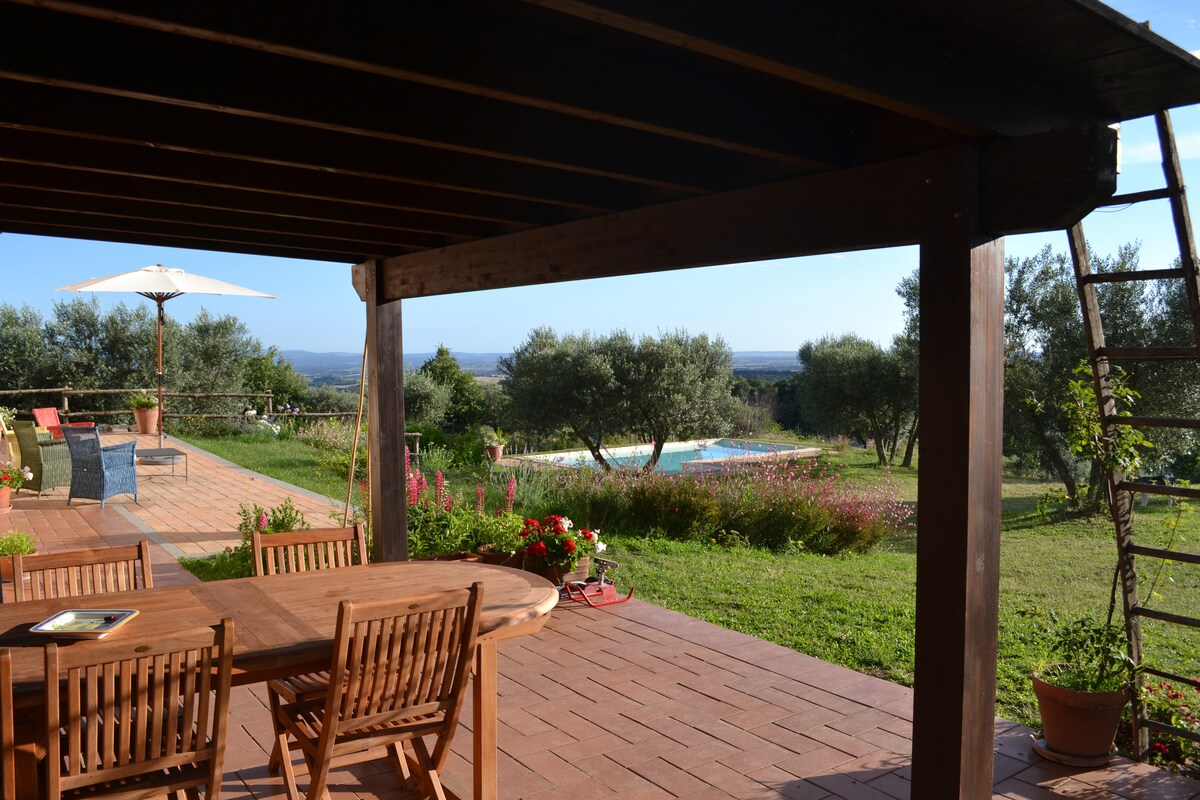Placed in the Manciano countryside, in the intact landscape of South Tuscany, 20 min from the Saturnia Cascades, Casa Olivia is an apartment in a farmhouse in the center of an age-old olive grove. From the garden and the house you can enjoy an incredible view on the Maremma hills with the Argentario coast in the background. Uncontaminated nature, peace and a wide choice of excursions in the surrounding area between art, history, sea and traditions. 30 minutes from beaches and beautiful villages