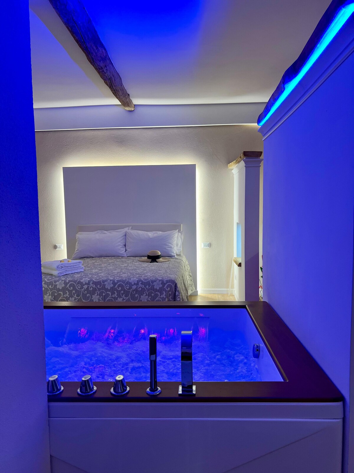 Esclusiva Suite per due, nel borgo medievale di Sutri (VT) studiata per garantire il massimo della privacy e del comfort. La suite dispone di: -vasca idromassaggio e doccia per due entrambe con cromoterapia -camino -cucina attrezzata -asciugamani e kit saponi bagno monouso -tv e Wifi con fibra -bottiglia di prosecco e dolce di benvenuto -caffè e tisane -Alexa -parcheggio gratuito a pochi metri dalla casa
