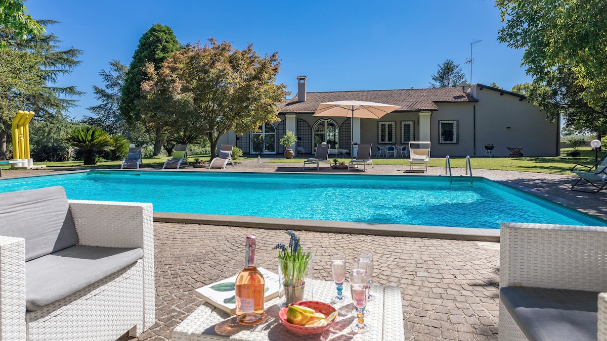Villa Elda , un gioiello sul suggestivo lago di Monterosi è situato al interno del nostro parco secolare con uliveti, alberi frutta e laghetto pesci Zen . Stupenda Piscina outdoor , Può accogliere fino a 10 ospiti. 4/5 lussuose camere matrimoniali e 7 bagni, due splendidi saloni, 2 cucine attrezzate, terrazze panoramiche. Sauna, bagno turco, area fitness, SPA con piscina infinity, forno pizza esterno, BBQ. Helipad , Golf nazionale di Sutri , Vallelunga, 35 minuti da Roma.