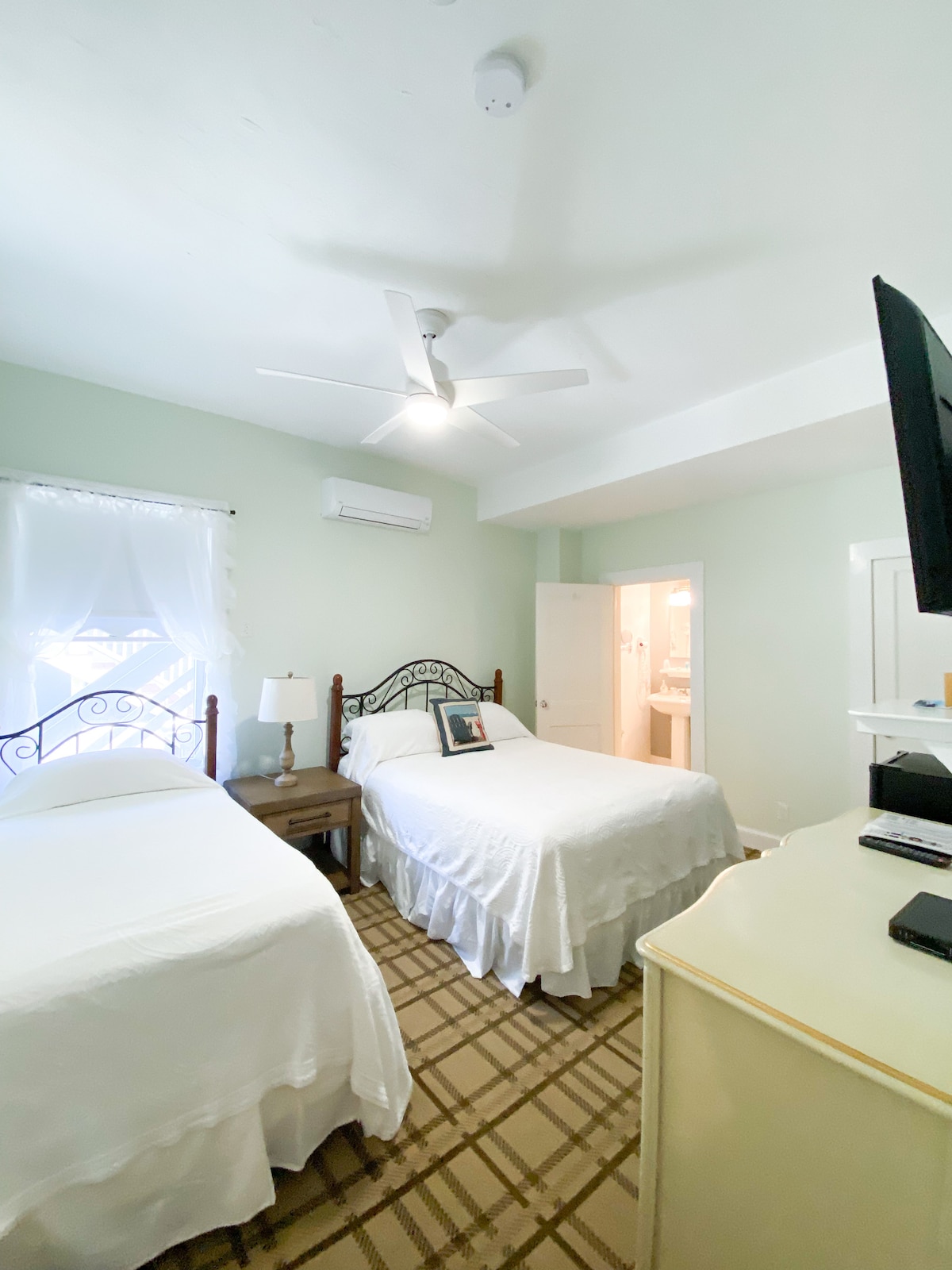 Room #1 is one of 3 bedrooms on the second floor (4 on the first floor). Upstairs rooms are larger, have bigger outdoor decks, and amazing views of the ocean. This room has a Queen sized bed as well as an extra long twin bed, with a twin sized trundle bed.