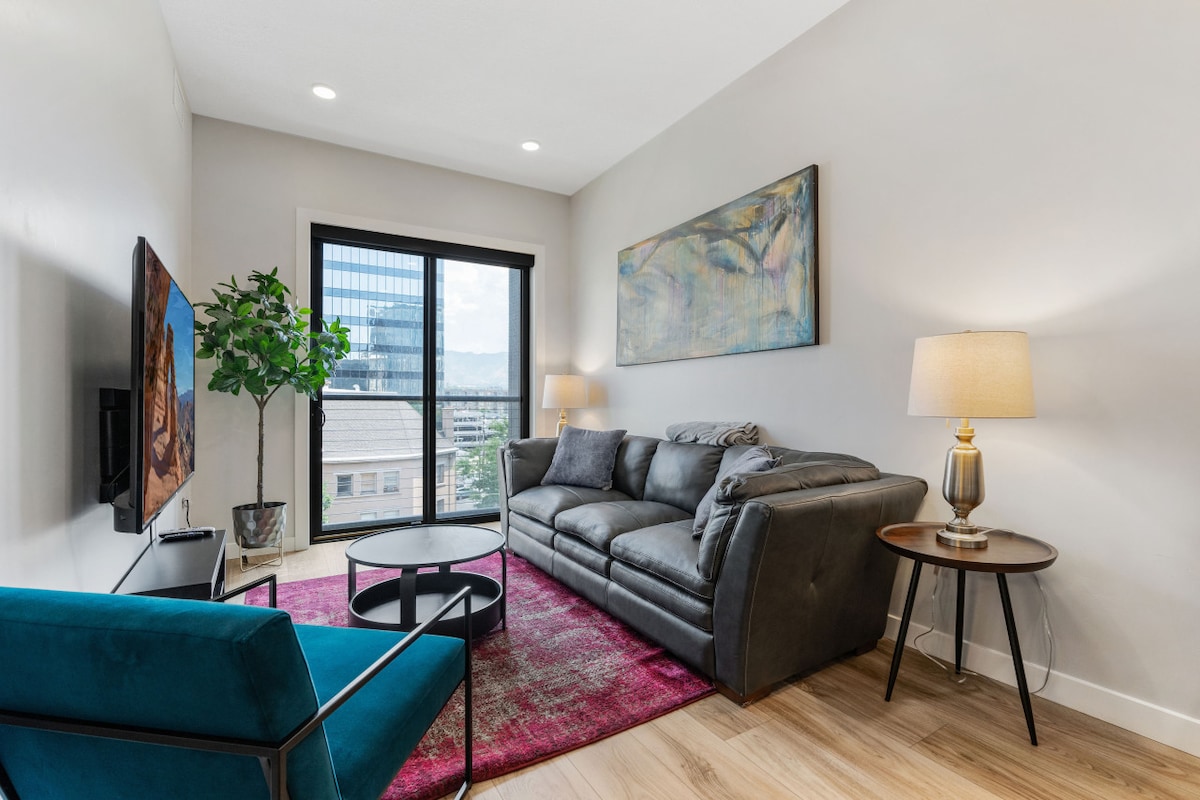 Gorgeous 1-bedroom executive suite apartment in a beautiful apartment complex in the Heart of Provo. Ask about our 30,60,90 day promotion! →Walk to Convention Center (7 min). →Walk to restaurants and shopping. →Great for couples and traveling executives. →Come and go with ease and privacy. • Private keyless entry on the second floor! • 4k Smart TVs • Secure, Fast 400+ Mbps Wi-Fi. • Huge King bed. • Blackout Curtains. ✔Professionally cleaned and sanitized between every guest
