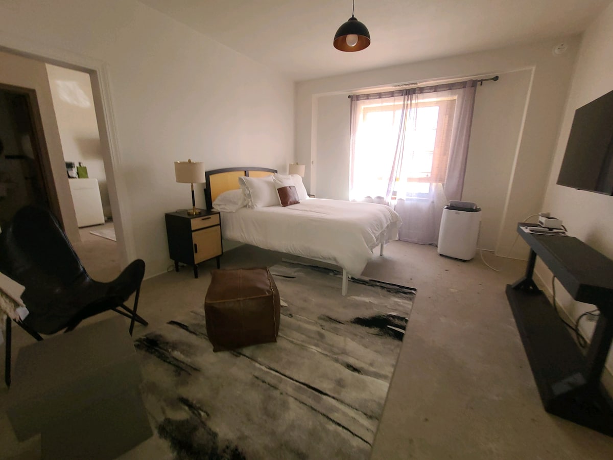 Jr Suite and the Max Bedroom and living room, 1 and ½ bath with smart TV, refrigerator, coffee maker, weekly housekeeping and laundry Free WiFi and Internet, heat and AC included, access to patio grills, pool table, Foosball, and large screen TVs. Full bed