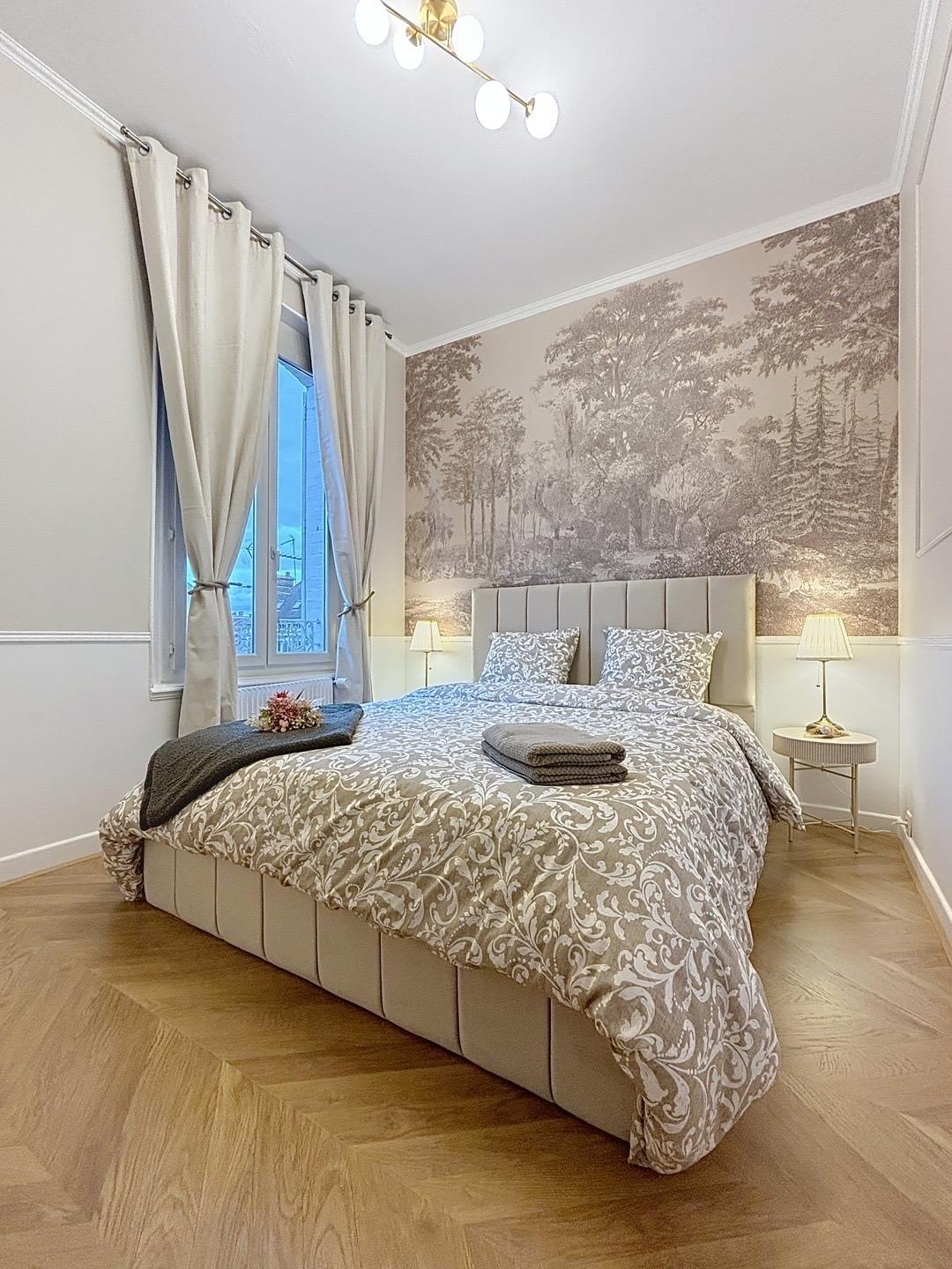 Un appartement haussmannien des années 1900 entièrement repensé, avec son papier peint panoramique signature, ses moulures, son parquet et sa vue sur les monuments illuminés. Lit king size haut de gamme, décoration soignée et salle de bain moderne, pour un séjour aussi confortable qu’apaisant. Chambre côté cour, le silence absolu. Situé en plein centre historique, directement sur la place principale, l’appartement permet de rejoindre à pied les monuments, restaurants et boutiques de Troyes.