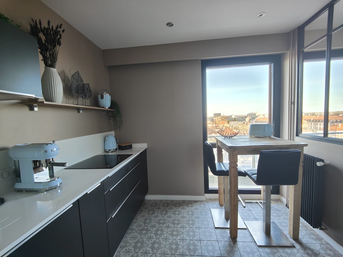 Appartement très lumineux de 50m2 aux prestations haut de gamme. Venez profiter d’une vue exceptionnelle de jour comme de nuit sur le Vieux Troyes. Vous pourrez vous détendre dans une balnéo de standing. Vous passerez la nuit dans une chambre offrant une literie digne d’un grand hôtel ainsi qu’une télévision très grand format. Le long balcon vous permettra d’admirer la vue en profitant de l’extérieur. Votre voiture sera stationnée dans un box sécurisé au sous-sol de l’immeuble.