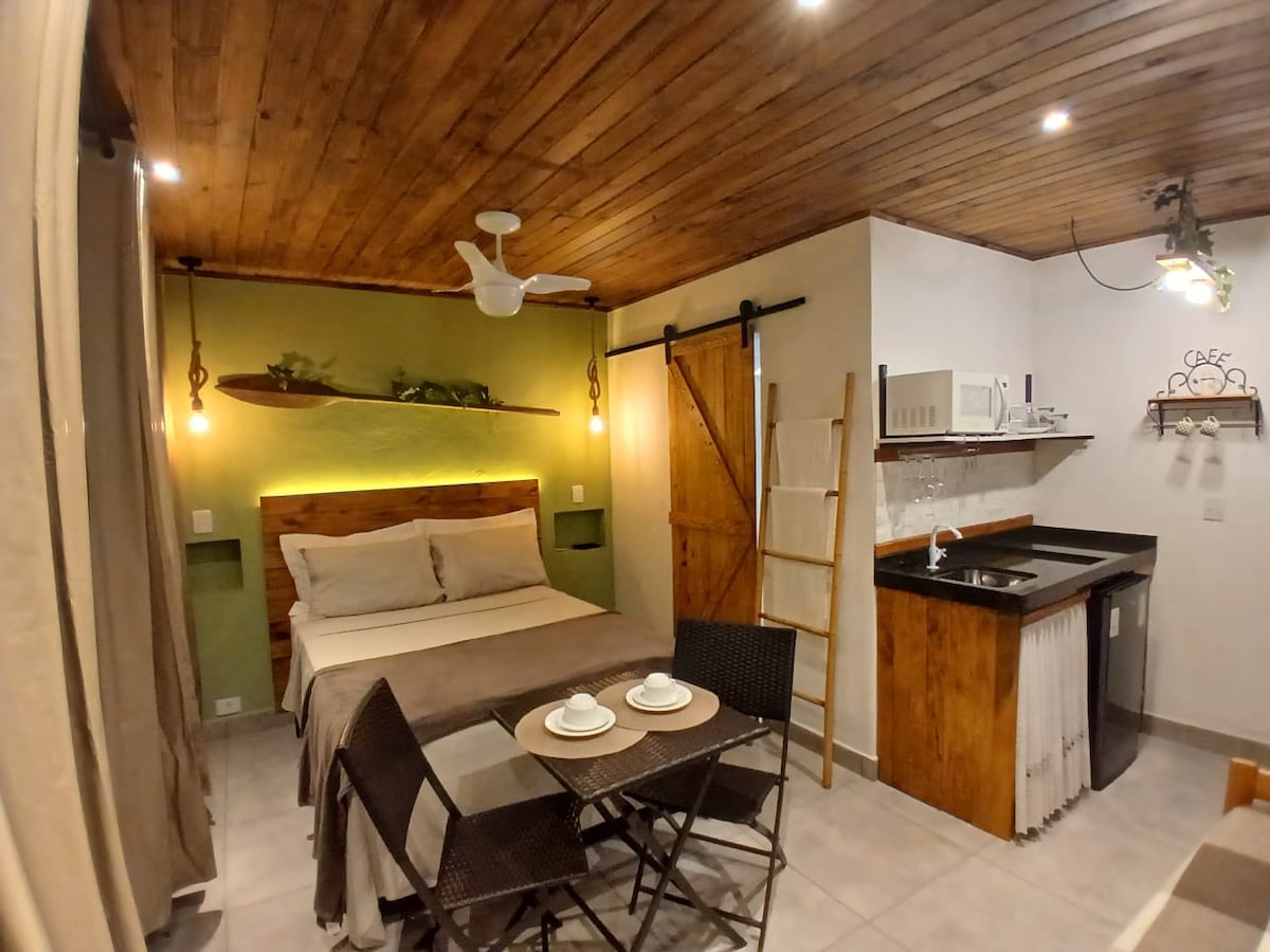 Charmosos estúdios self catering na linda praia do Prumirim. Entrada independente, pátio privado, cozinha totalmente equipada, cama queen size de alta qualidade, sala de estar confortável. Tudo projetado com qualidade, conforto e estilo. Grandes janelas panorâmicas que vão fazer você se sentir entre as copas das árvores! Este é um lugar mágico para quem procura uma fuga romântica à beira-mar conectando-se à natureza sem comprometer seu conforto. Tudo meticulosamente limpo, sanitizado e seguro!
