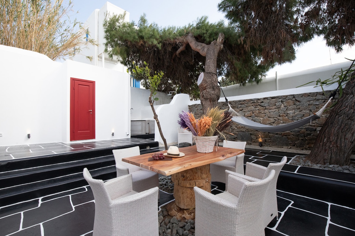 Experience The Traditional Mykonian Hospitality. This is the retreat everyone is seeking! Here, nature awaits your discovery. Relax in this serene atmosphere, where every detail is designed to help you rejuvenate. A true sanctuary of peace, where you can prioritize the tranquility of mind, body, and soul. Enjoy the limitless views of the mountains and the sea, accompanied by the scents and sounds of nature and the salty breeze. Relax and have everything you need for an unforgettable experience!