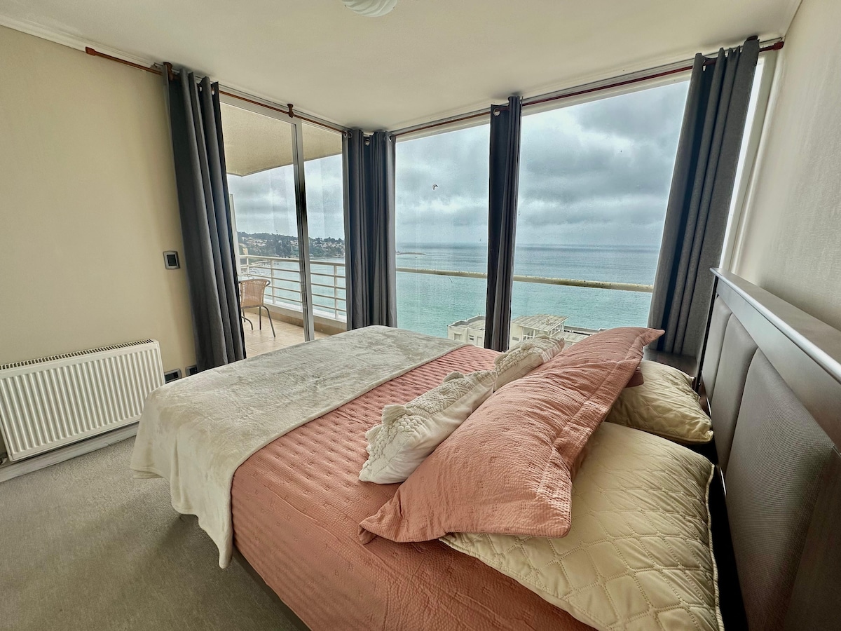 Moderno depto de 65 mts2 en el piso 22 en Costa de Montemar, tiene terraza con vista al mar panorámica. Dos habitaciones, una suite con cama 2 plazas y smart tv de 55’’ con tv cable y netflix y otra con dos camas 1 plaza. Dos baños full equipados con bañera. Cocina americana full equipada y lavadora. Estacionamiento.Parrilla. Wifi. A 2 km (15 min caminando) de la costa, playa los Lilenes, club de yates y dunas de arena. A 2,5 km del supermercado Jumbo, farmacias y locales comerciales.