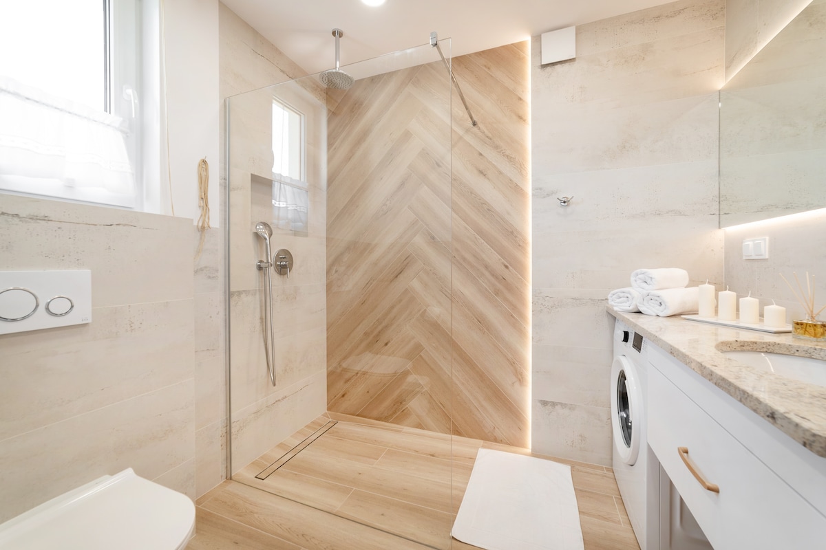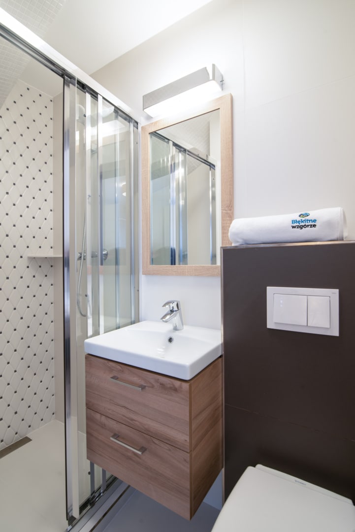 Przestrzeń apartamentu ma ok. 20m2 pozwala to na swobodę korzystania z całego obiektu dla 3 os. Pokój jest oddzielony osobnym wejściem od aneks kuchennego i łazienki. Budynek jest wzorowany na nowoczesnym budownictwie i w pełni wyposażony.