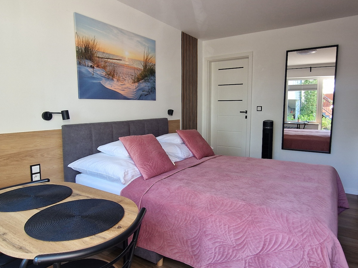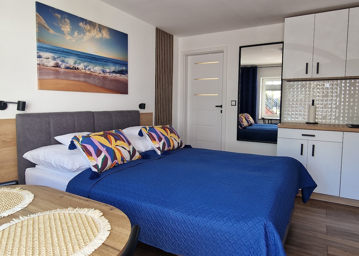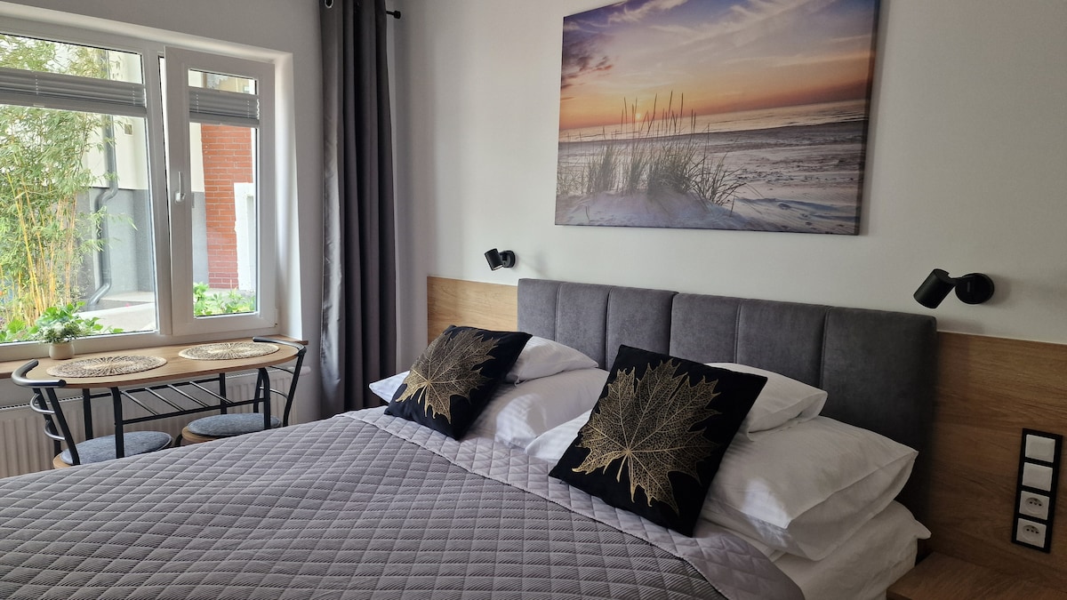 Przestronny pokój dla 2 osób z małym tarasem i prywatnym wejściem, idealny na spokojny wypoczynek nad morzem. Położony na parterze, z bezpośrednim dostępem do ogrodu i widokiem na wewnętrzny dziedziniec. Do dyspozycji Gości prywatna łazienka, aneks kuchenny do podgrzewania posiłków, Wi-Fi oraz smart TV. Możliwość pobytu z małym dzieckiem (łóżeczko). Parking płatny, zakaz palenia. Dodatkowo: rowery elektryczne Gazelle, pralnia oraz ekspres z kawą (usługi płatne).