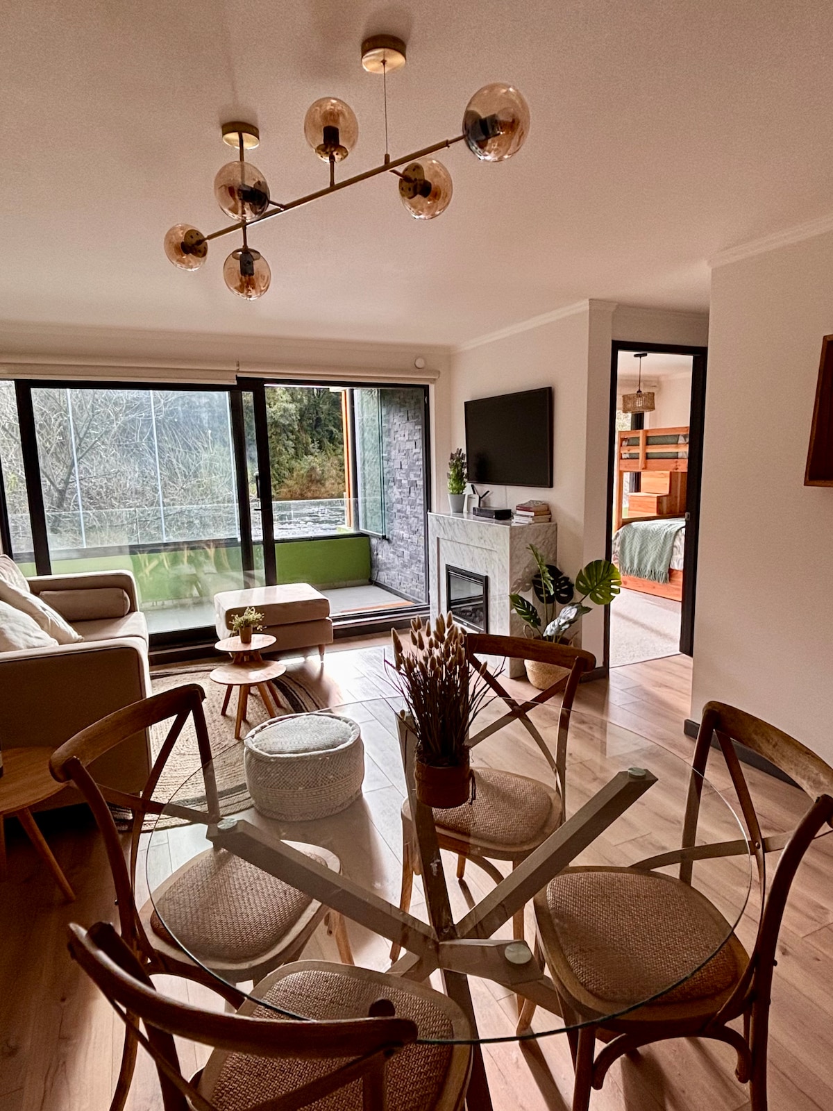 Spacious and fine apartment (2nd floor), in "Parque Pinares" condominium (www.parquepinares.cl), located on the shore of Lake Villarrica, with private access to the Lake and surrounded by native trees and very close to Pucon (less than 1 Km). With large living room and terrace overlooking the lake, boats and mountains. Suite bedroom with lake view, walk-in closet, security box and large bathroom. It can go to a wide variety of restaurants, casino and nightclubs, Walking or in Uber.