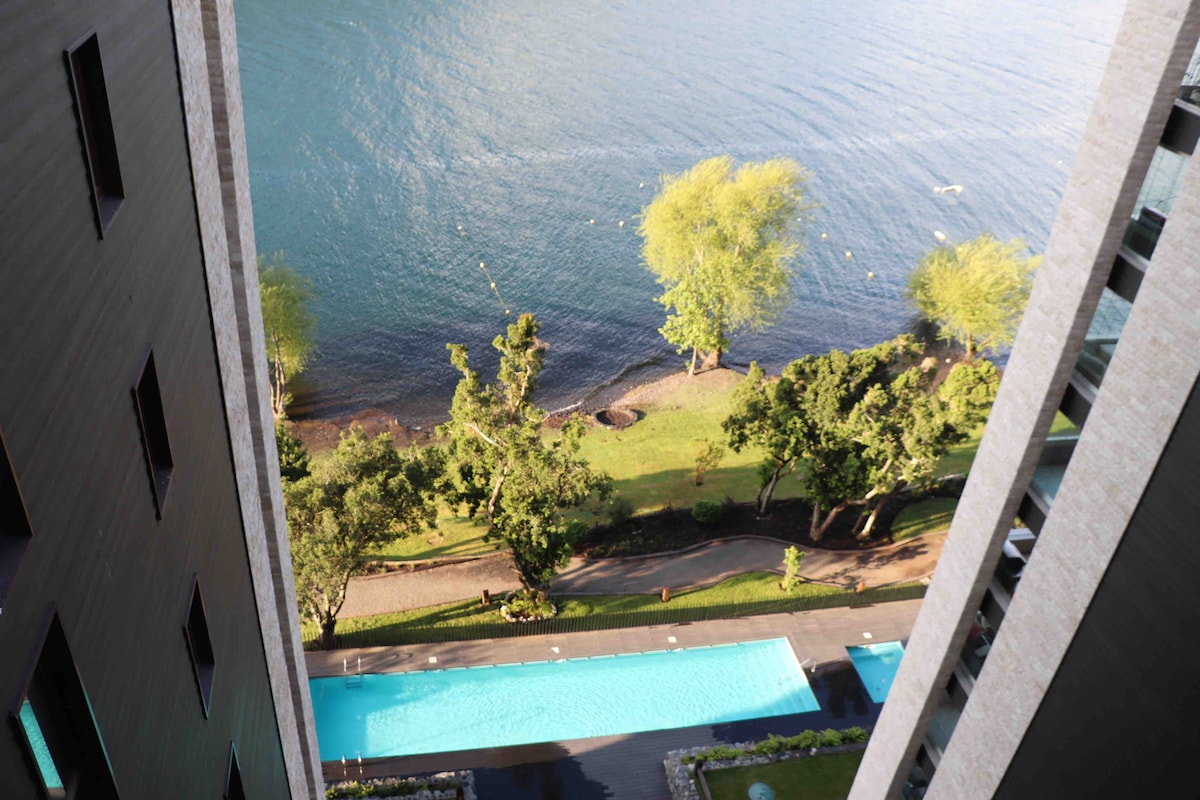 Moderno y amplio depto (piso 9) , ventanas termo panel, equipamiento de alta calidad. Ubicado en Km 2 camino villarica-pucon, a 50 metros de la orilla del lago. Exclusivo condominio de edificios con Nautica, muelle, playa privada, parques, club house con Jacuzzi, sauna, sala de juegos ** Estacionamiento privado (capacidad para un vehiculo.) ** Cama King ** Depto climatizado invierno-verano ** Vistas al lago ** Smart Tv incluye internet y tv nacional.