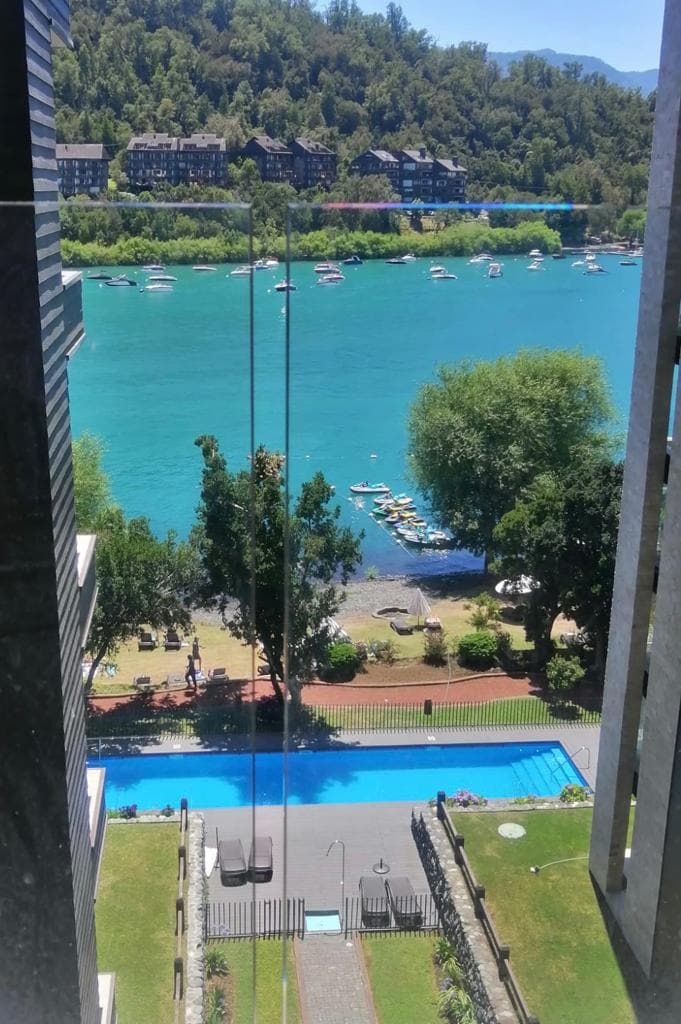 Spacious and fine apartment (2nd floor), in "Parque Pinares" condominium (www.parquepinares.cl), located on the shore of Lake Villarrica, with private access to the Lake and surrounded by native trees and very close to Pucon (less than 1 Km). With large living room and terrace overlooking the lake, boats and mountains. Suite bedroom with lake view, walk-in closet, security box and large bathroom. It can go to a wide variety of restaurants, casino and nightclubs, Walking or in Uber.