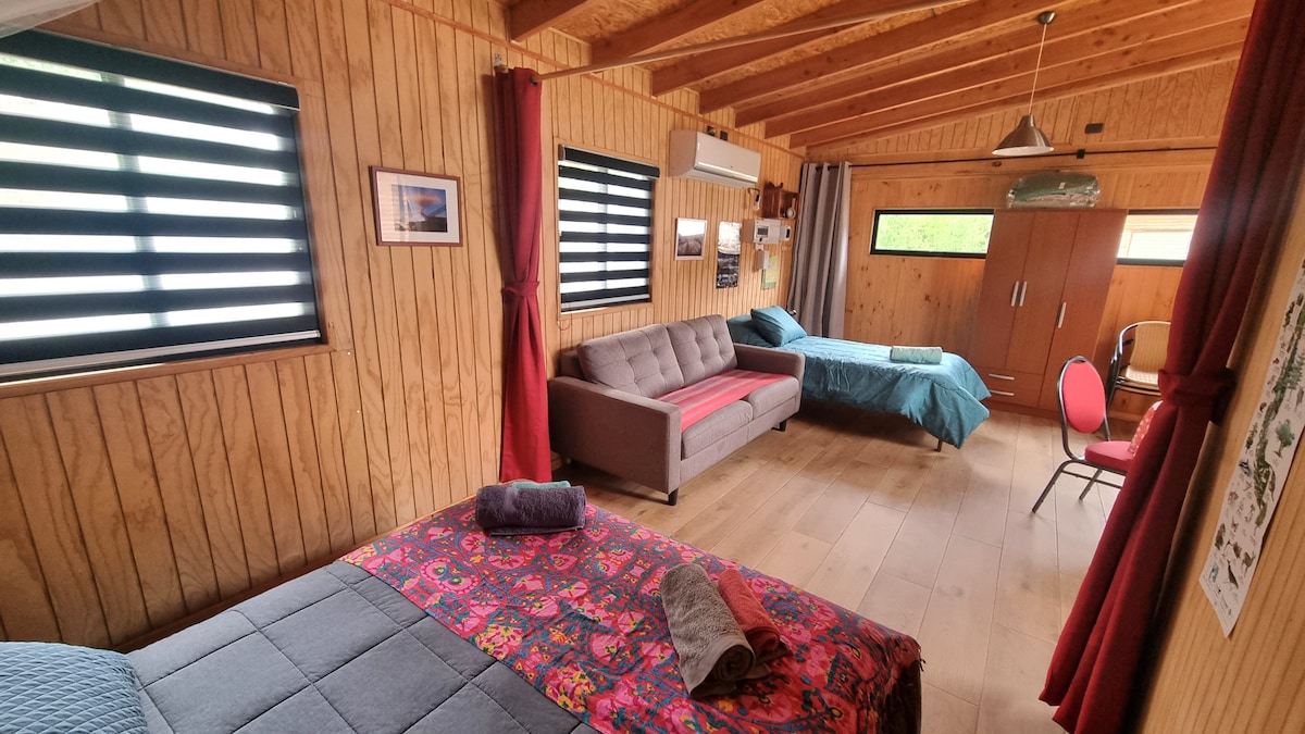 No querrás irte de este lugar tan único y encantador. Ven, disfruta y desconectate unos dias con una vista hermosa, rodeada de naturaleza y porsupuesto serán muy bien acogidos ❤️, contamos con TINAJA CALIENTE PRIVADA (con costo adicional), a minutos del centro, centros termales y parques nacionales villarrica y huerquehue, santuario el Cañi y diversos saltos de agua, contamos con servicio de lavandería, transporte, guía turístico certificado, tragos de la casa, tablas para picar y mucho más!
