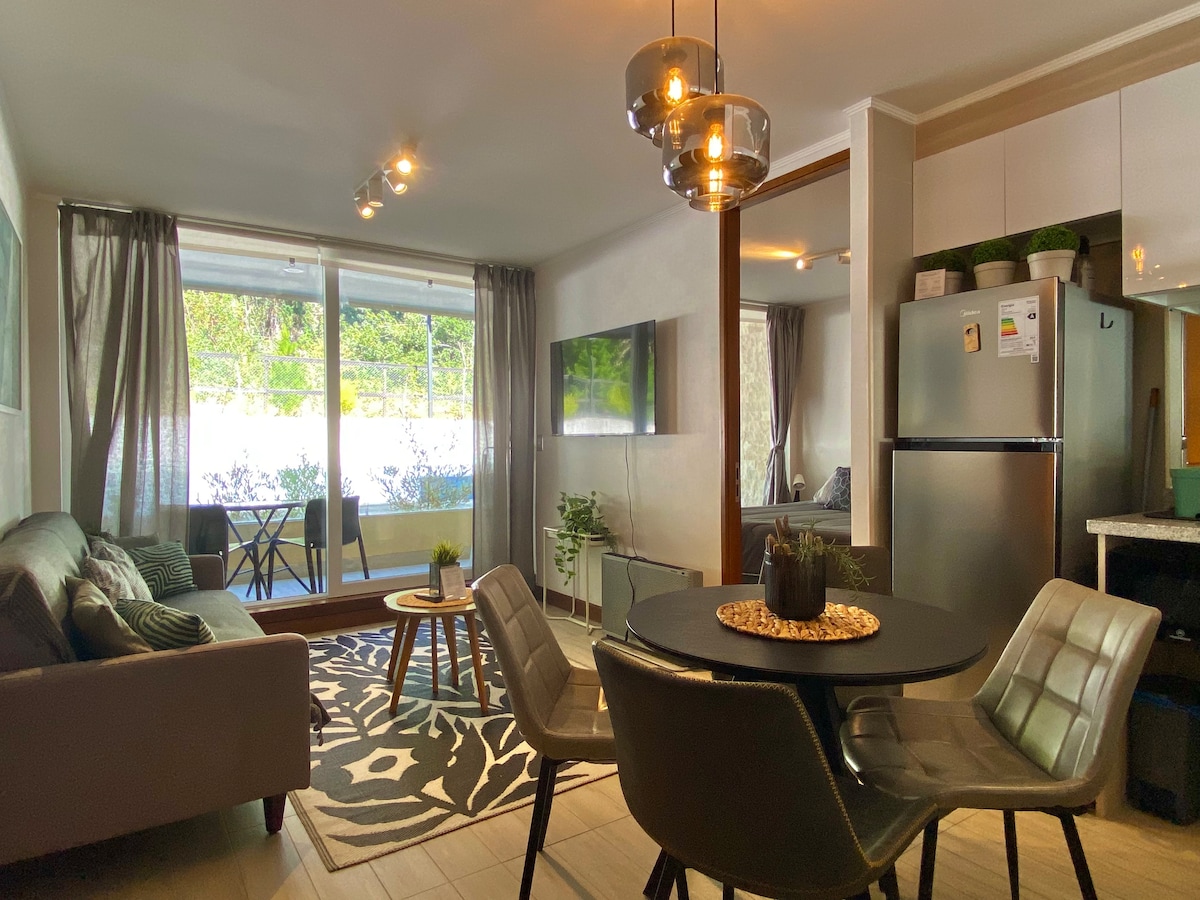 Departamento tipo estudio , en un ambiente tranquilo y natural pero sólo a 5 minutos del centro de Pucón. WIFI fibra óptica 500 megas. Estacionamiento privado, seguridad 24/7, piscina interior y exterior (disponibles según temporada) , quincho, sala de eventos y lavanderia comunitaria Ropa de cama y toallas limpias al momento de tu llegada. Nos preocuparemos de que todo esté listo para tu llegada , solo preocúpate de disfrutar.