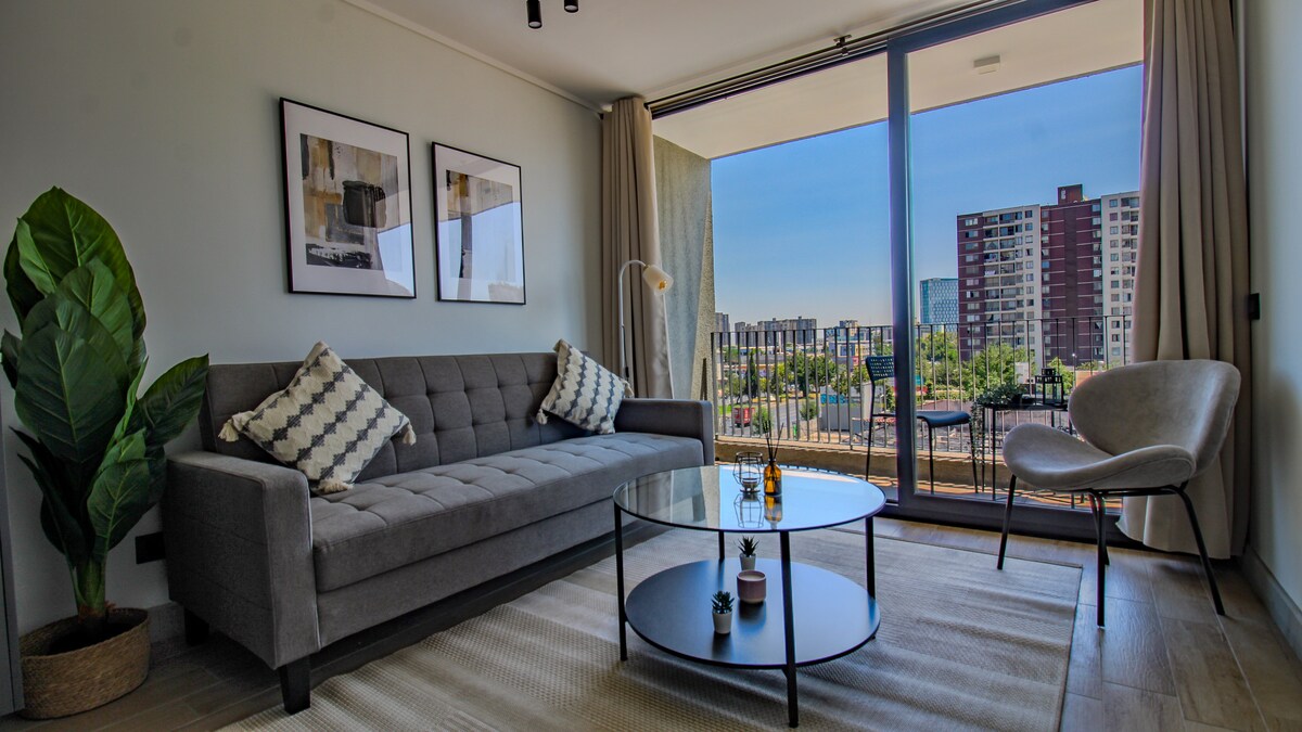 Hospédate y disfruta de este moderno departamento con vista despejada, donde el patrimonio y la historia de Santiago se despliegan ante tus ojos. Cercano a Parque O’Higgins, Movistar Arena, Club Hípico, universidades, restaurantes, comercios y servicios, con fácil acceso al vibrante corazón de la ciudad. Viajas por negocios, estudio o placer? Este espacio es perfecto si buscas comodidad, diseño y una conexión única con la esencia de la capital chilena. ¡Reserva tu estadía y vive Santiago!