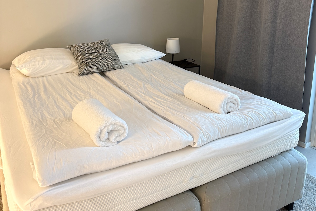 Ainutlaatuinen, maalämpötalossa sijaitseva kaunis condo-huoneisto, jossa oma sisäänkäynti, makuuhuone, ruokailutila, sauna, suihku ja wc. 2 yötä yöpyville jacuzzi kuuluu majoitukseen 2h/pv. Muutoin vuokra on majoituksen aikana viikolla su-to 35e/2h ja pe-la 49e/2h. Sijainti uudella asutusalueella luonnon läheisyydessä nopeiden yhteyksien päässä. Laadukas Queen-size parivuode, 120 cm vuodesohva ja mahdollisuus 90 cm varavuoteeseen. Koodilukko. Maksuton pysäköinti.